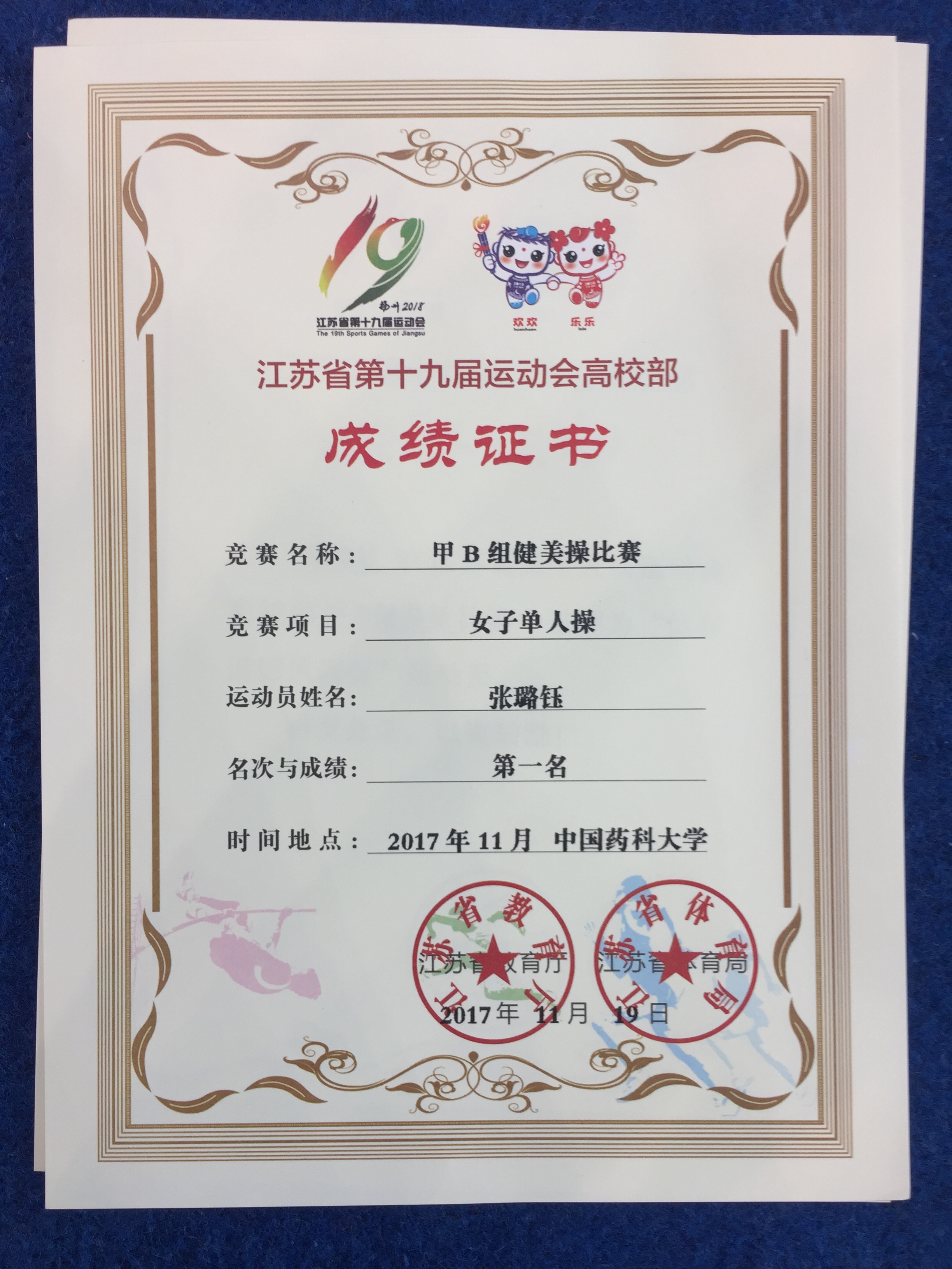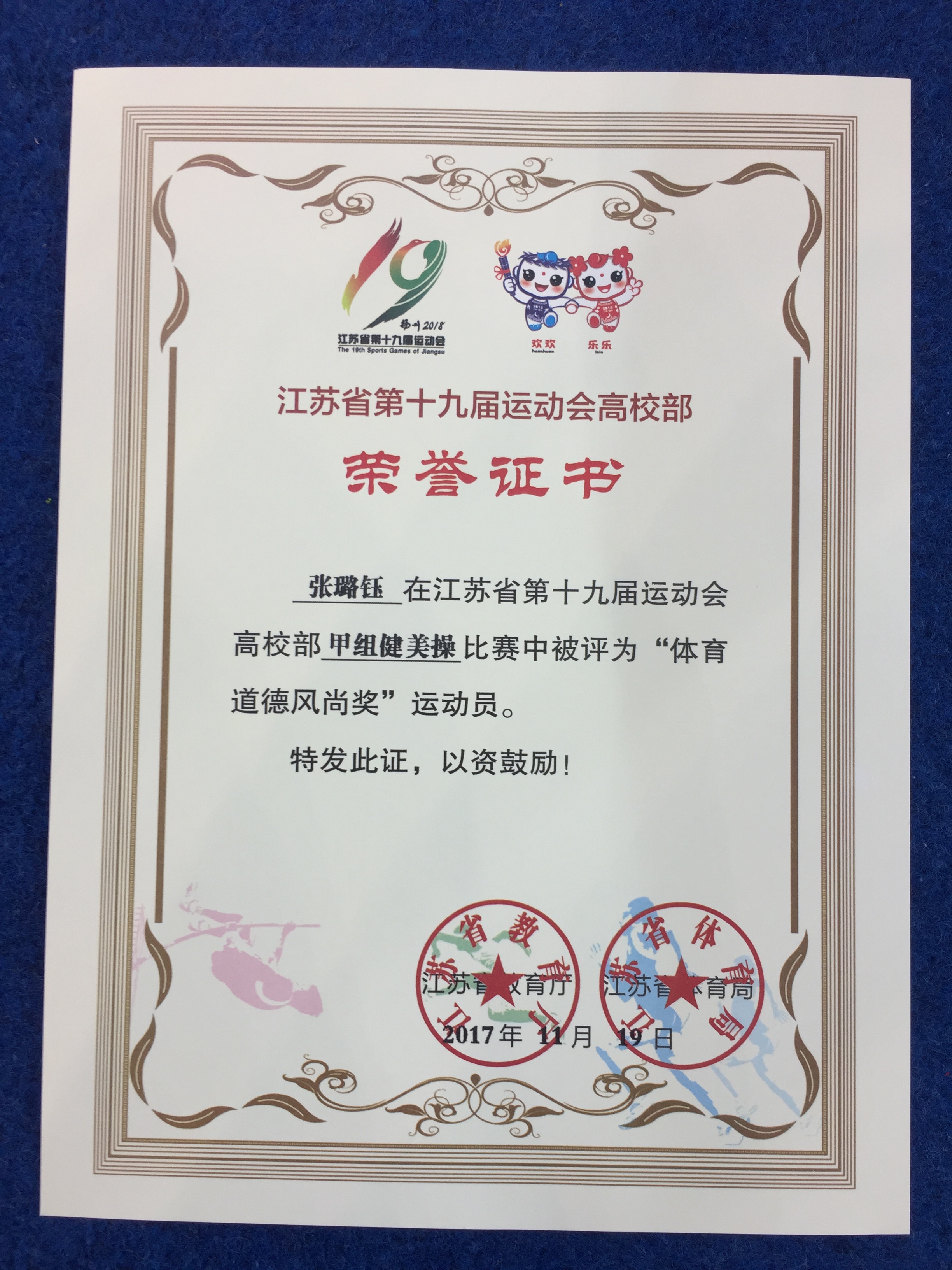 11月18-19日,江苏省第十九届运动会高校部甲组健美操比赛在中国药科大学举行。此次比赛近500名运动员参加,是本届省运动会高校部所有比赛中规模最大、参赛运动员最多的比赛。永利官网2015级学生张璐钰在甲组健美操比赛女子单人操项目中表现优异,在决赛中以15.90的优异成绩夺得冠军。此外,张璐钰还获得“体育道德风尚奖”运动员荣誉称号。