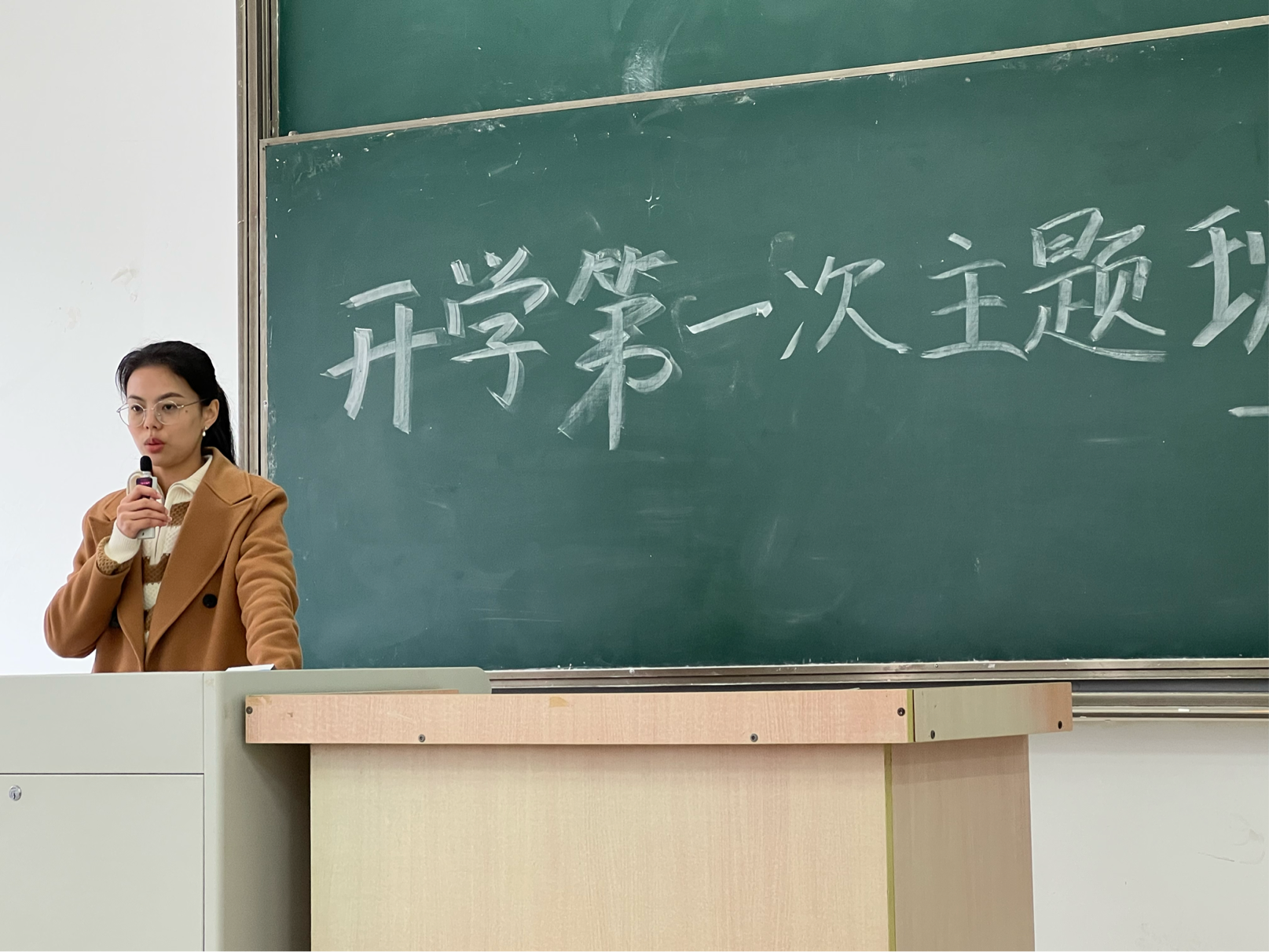 班主任杨胡方老师总结上学期的期末考试情况,希望同学们要重视学业,端正学习态度,改进学习方法。近期甲流严重,班主任关心同学们健康状况并提醒同学们注意防护。杨老师强调在大学里同学们要养成及时看通知,明确规划好自己安排的良好习惯,希望同学们自觉自律,认真做好学校里的每一件事。