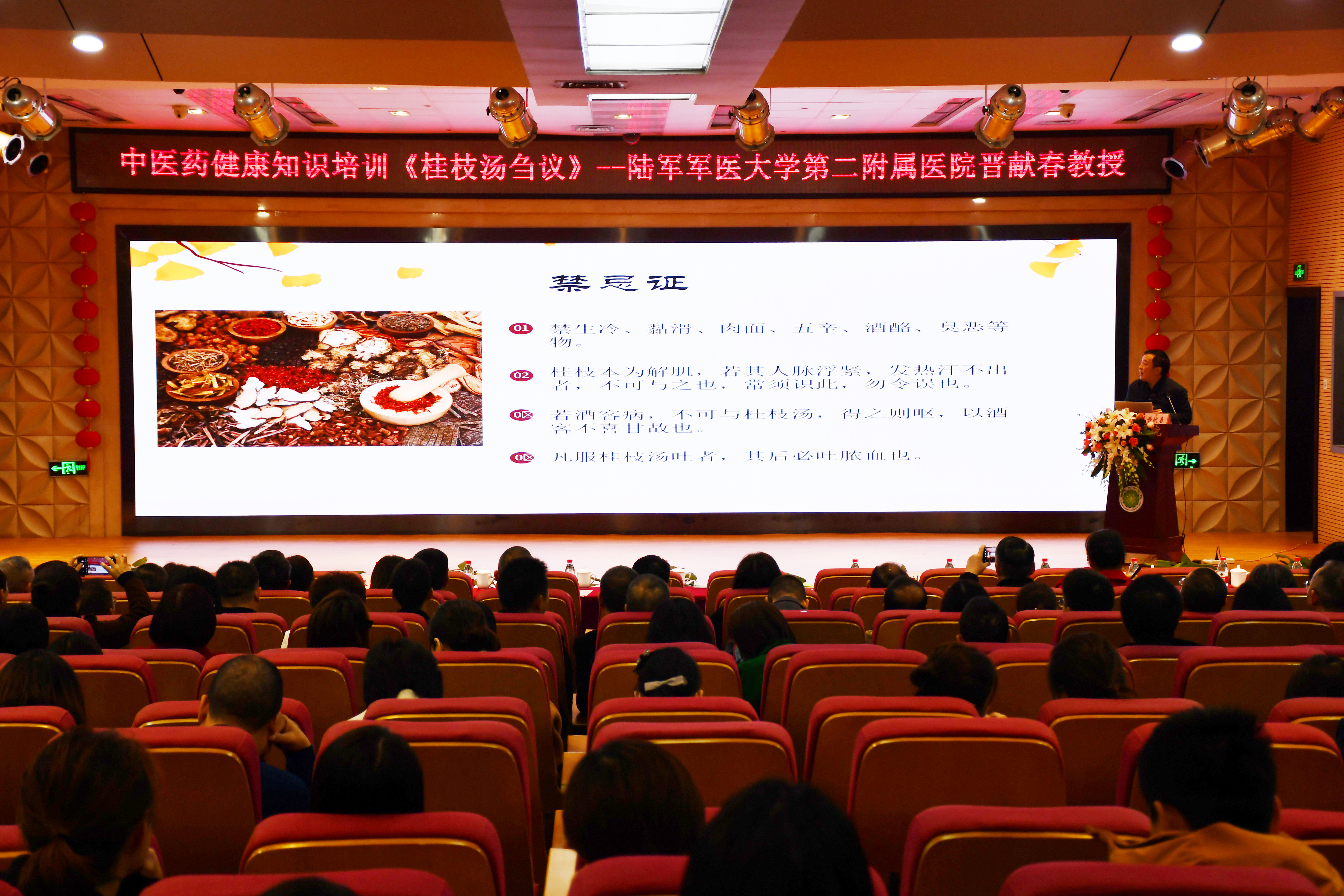 在中医药健康知识培训现场,陆军军医大学第二附属医院(新桥医院)中医科主任中医师晋献春教授以通俗的语言、鲜活的病案为切入点剖析源自《伤寒论》的中医经典名方——“桂枝汤”。