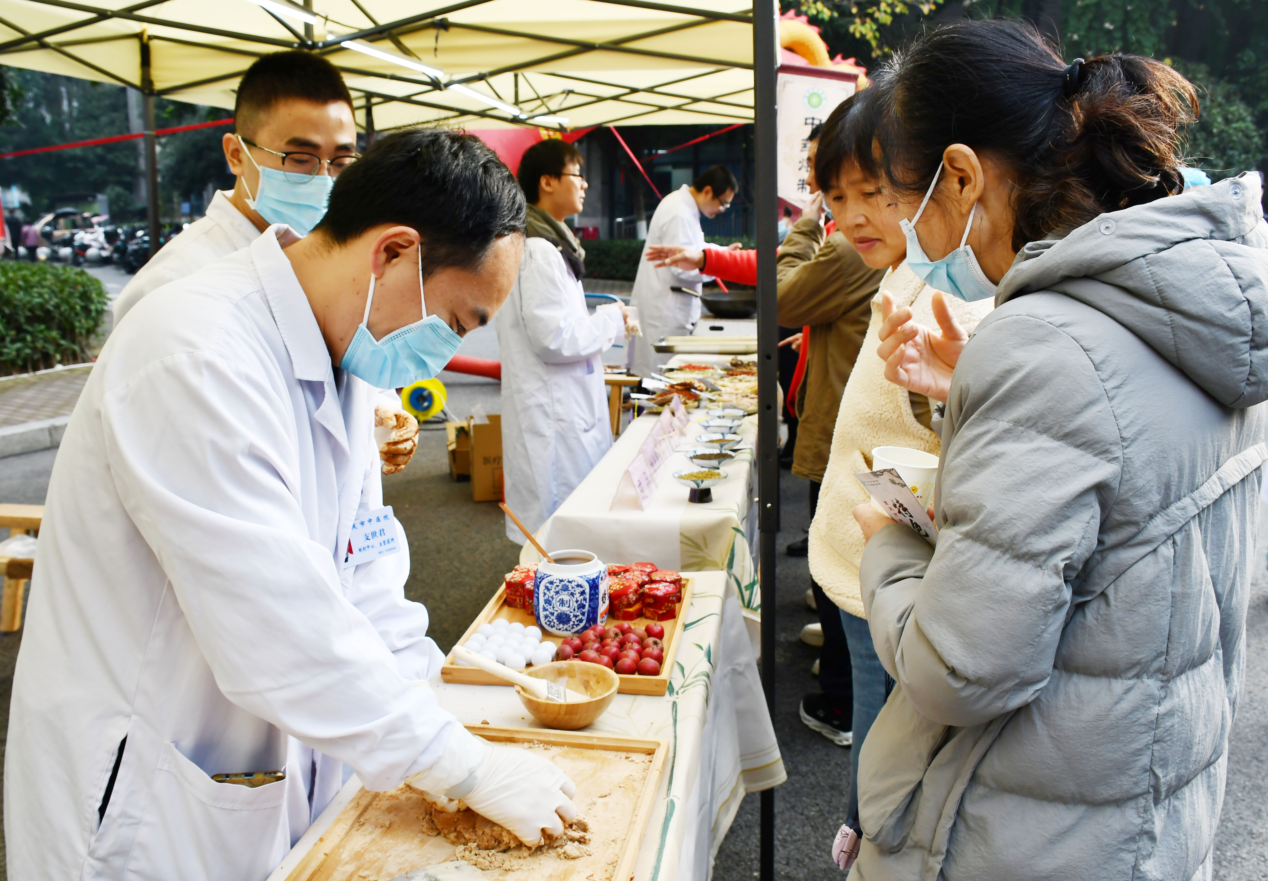 在膏方文化展示现场,石斛玉竹乌鸡汤等中药食疗汤包一亮相就备受市民喜爱,清咽糖浆、肤光药浴散、肿意膏等特色院内制剂也引来大批市民围观咨询,山药茯苓饼干、玫瑰杏皮茶、四神元气茶等中药茶饮尤其吸引年轻市民的关注。