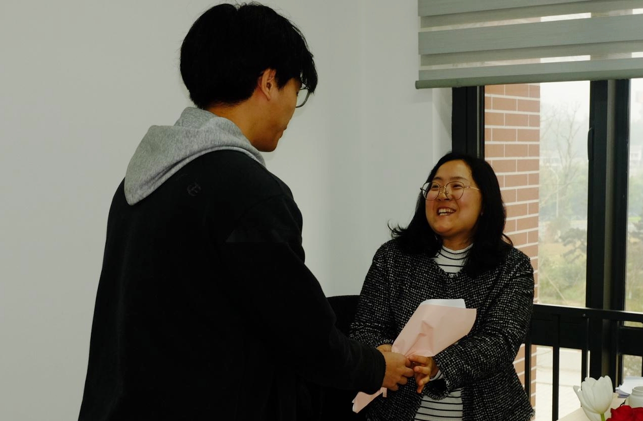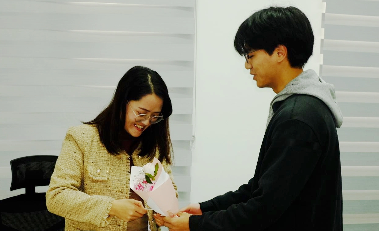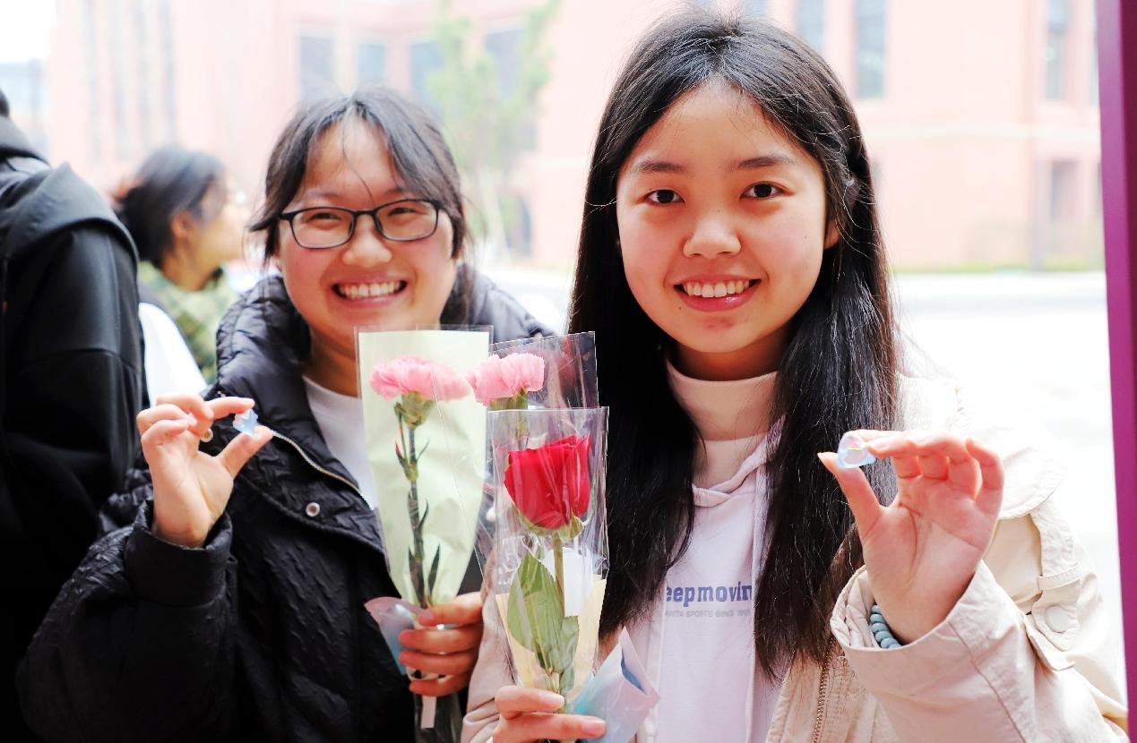 男同学们“突袭”送上节日祝福的鲜花,给女老师们送去了甜蜜的惊喜。