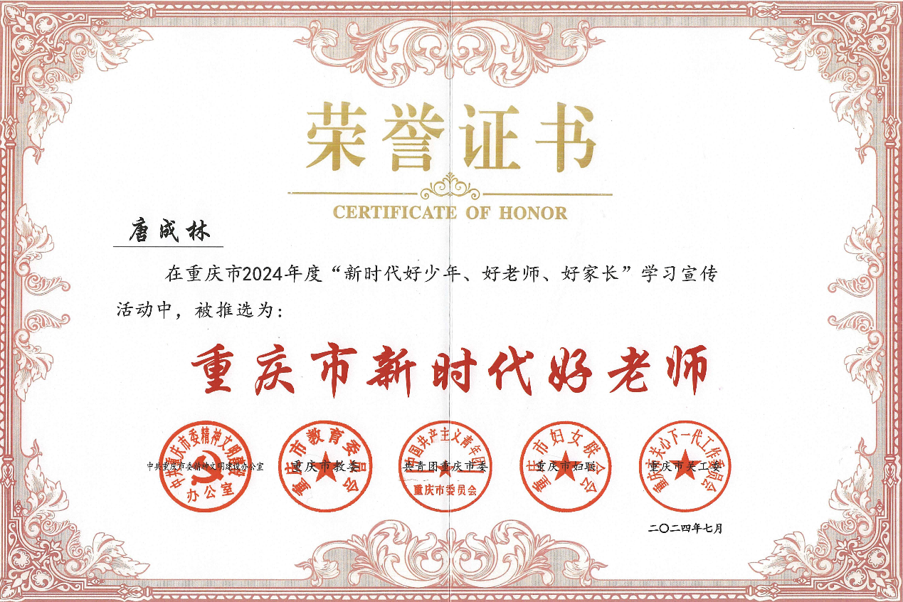 近日,由中共重庆市委精神文明建设办公室、重庆市教委、共青团重庆市委、重庆市妇联、重庆市关工委联合开展的重庆市2024年度“新时代好少年、好老师、好家长”学习宣传活动评选结果公布,诸侯快讯针灸推拿学院院长唐成林被评为“重庆市新时代好老师”。