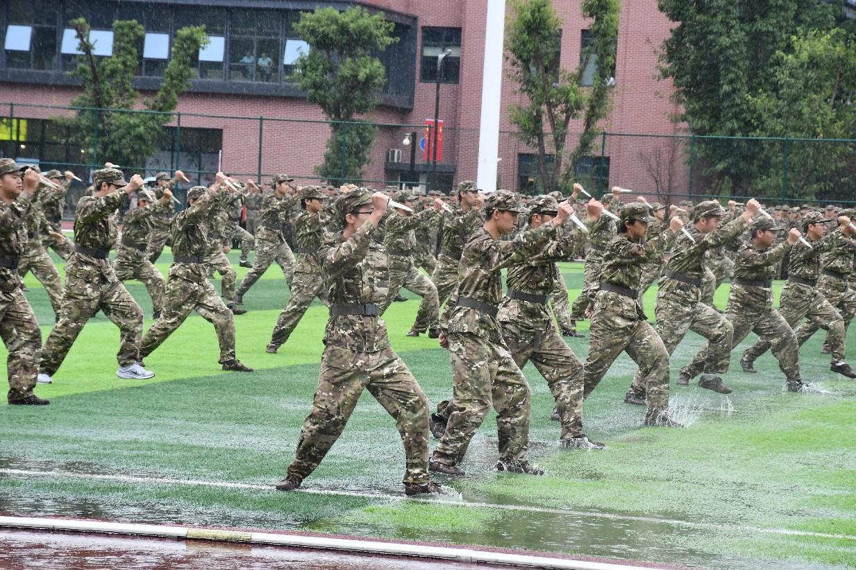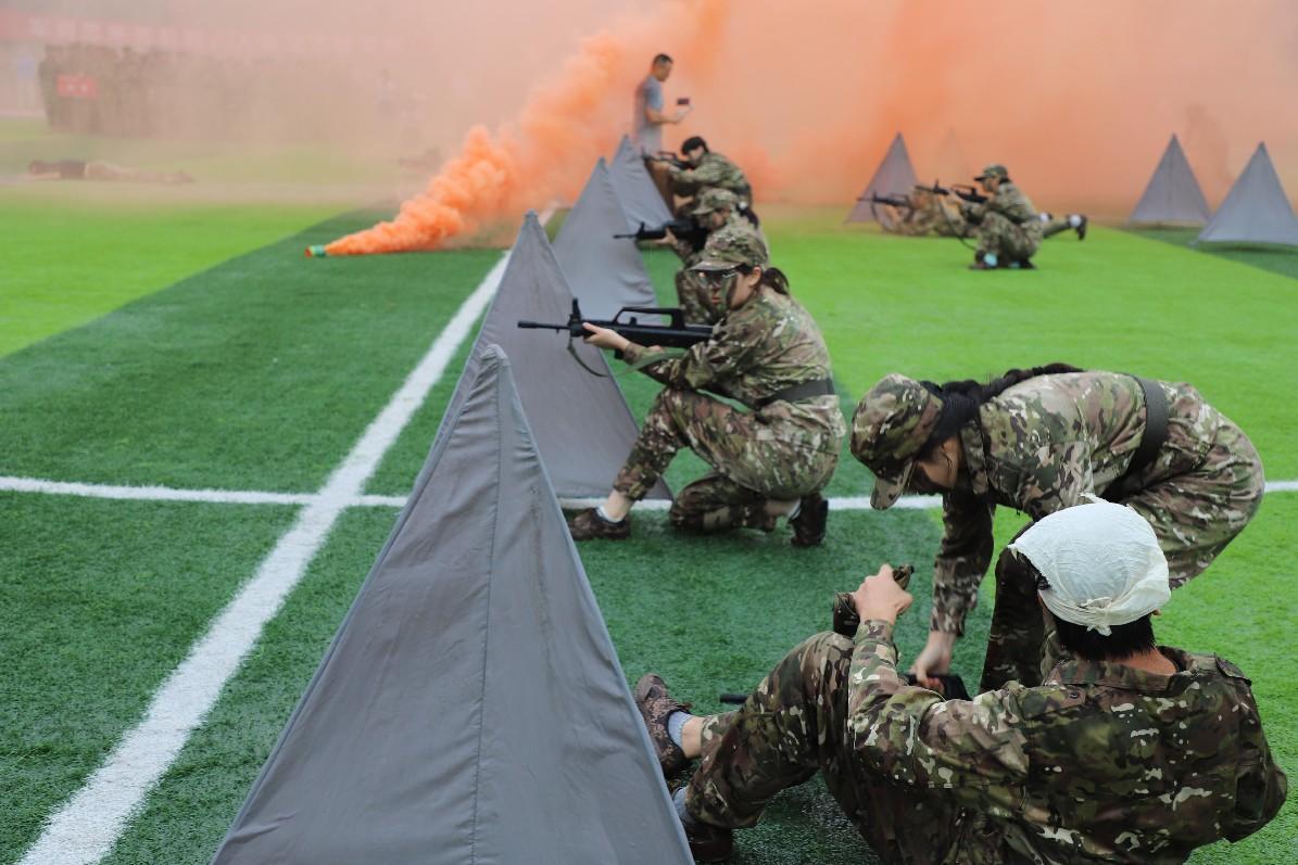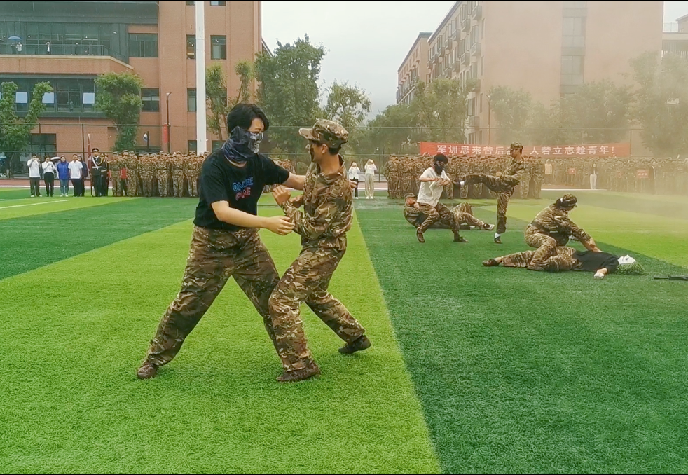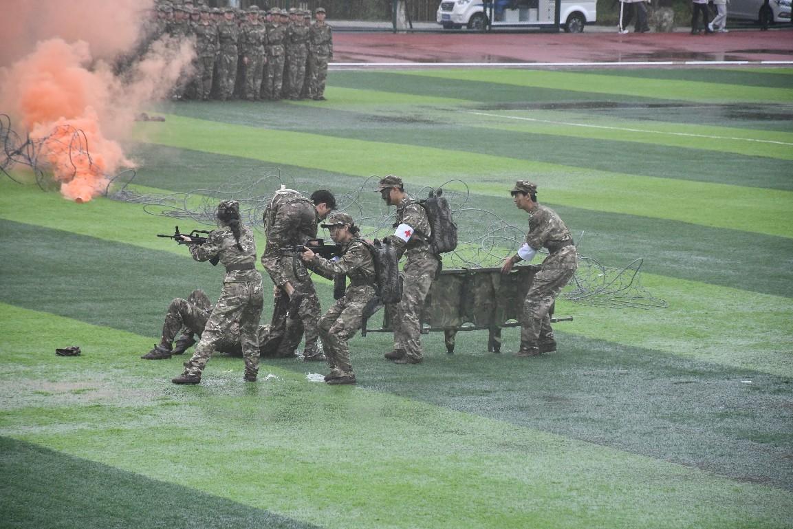 无惧风雨,不怕磨砺,汇报表演中,受阅新生们斗志昂扬,步伐铿锵有力,目光炯炯有神,脸上洋溢着青春的风采。国旗班护旗方队身姿挺拔,目光坚定,彰显着强国强军的坚定信念。分列式方队展示中,新生们脚步铿锵,整齐划一,口号响亮,热情昂扬。军体拳展示中,新生们身形矫健,拳拳用力、招招到位。匕首操展示中,闪转腾挪,气势磅礴,尽显赤诚爱国心。模拟攻防演练展示中,“战斗”紧张感瞬间拉满,运动场秒变“战场”,“战士们”动作敏捷,迅速出击,势如破竹,快速完成“人质解救”任务,尽显“英雄本色”。