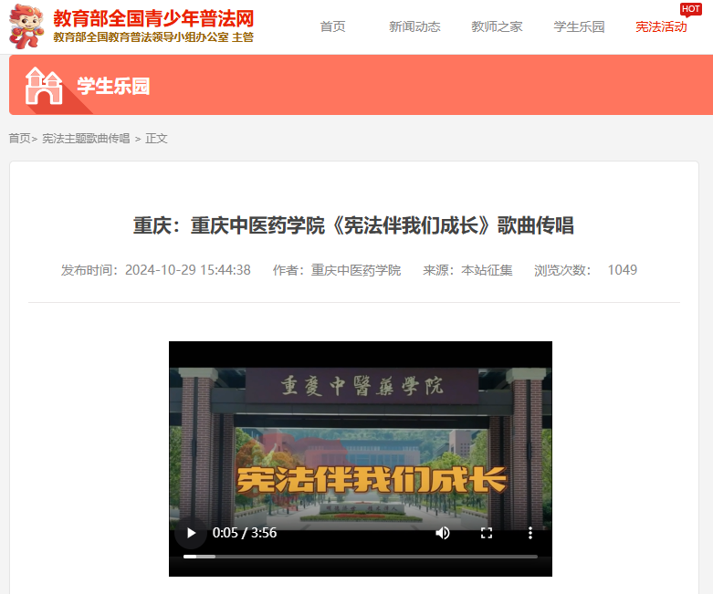 为全面贯彻落实党的二十大和二十届二中、三中全会精神,深入学习贯彻习近平法治思想,推动青少年宪法宣传教育常态化长效化,按照《教育部办公厅关于举办第九届全国学生“学宪法 讲宪法”活动的通知》(教政法厅函〔2024〕2号)要求,由党委学工部牵头组织,党委宣传部、马克思主义学院等支持配合,学生参与创作的《宪法伴我们成长》歌曲传唱MV作品被教育部全国青少年普法网收录展播。