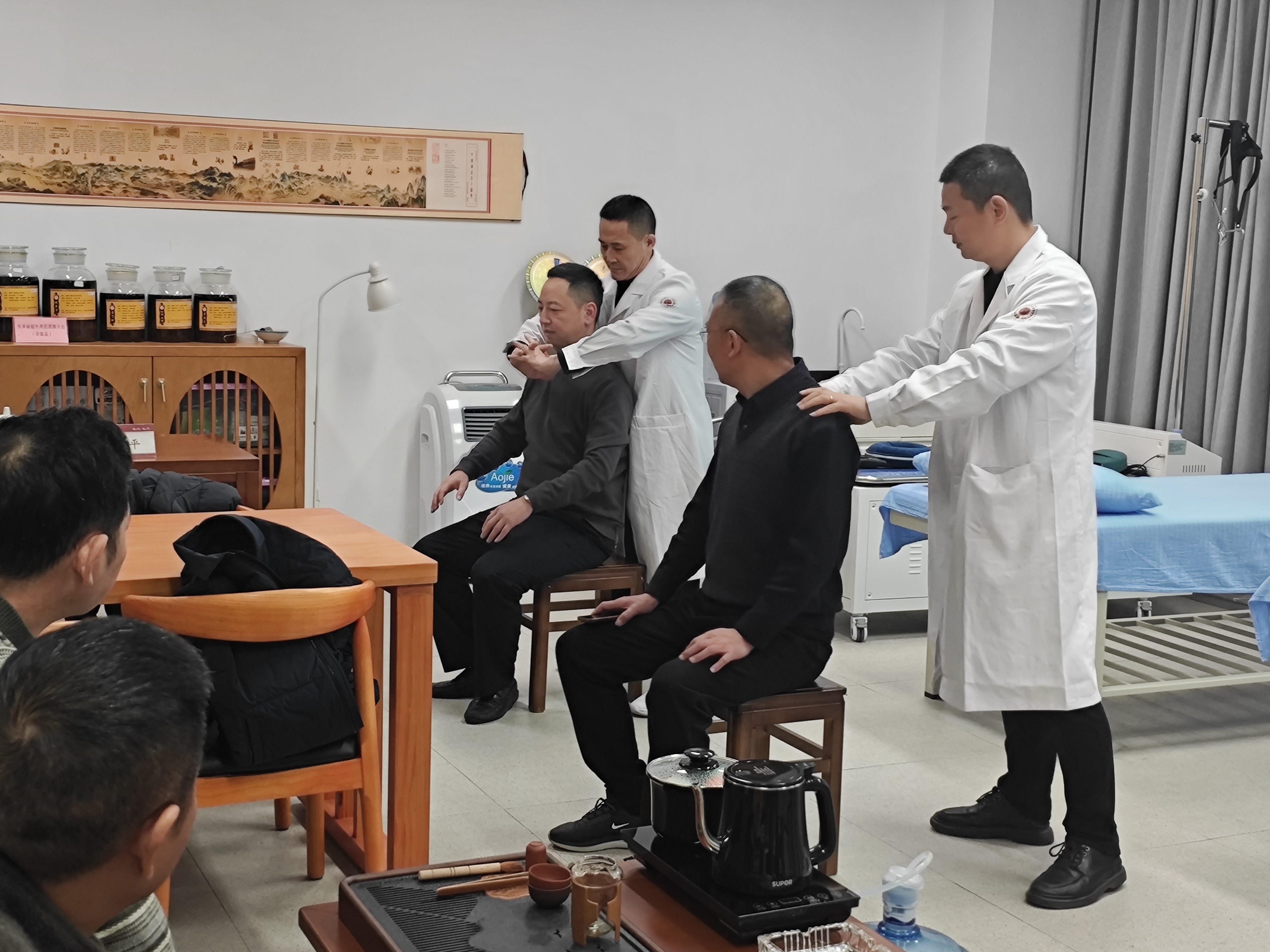活动中,各部门代表参观了学院针灸推拿实验室,了解了中药材的种类、功效以及中医诊疗方法,亲身体验了针灸、耳穴、推拿、脉诊等中医传统疗法,并围绕校园治安管理、食品安全监管等与学院相关部门进行了座谈交流,为学院提升校园安全管理水平提供了有益的思路和建议。