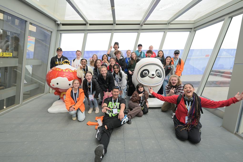 2024年3月21日,美国华盛顿州中学生代表团的成员在首钢滑雪大跳台上与冰墩墩、雪容融合影。新华社记者 李鑫 摄