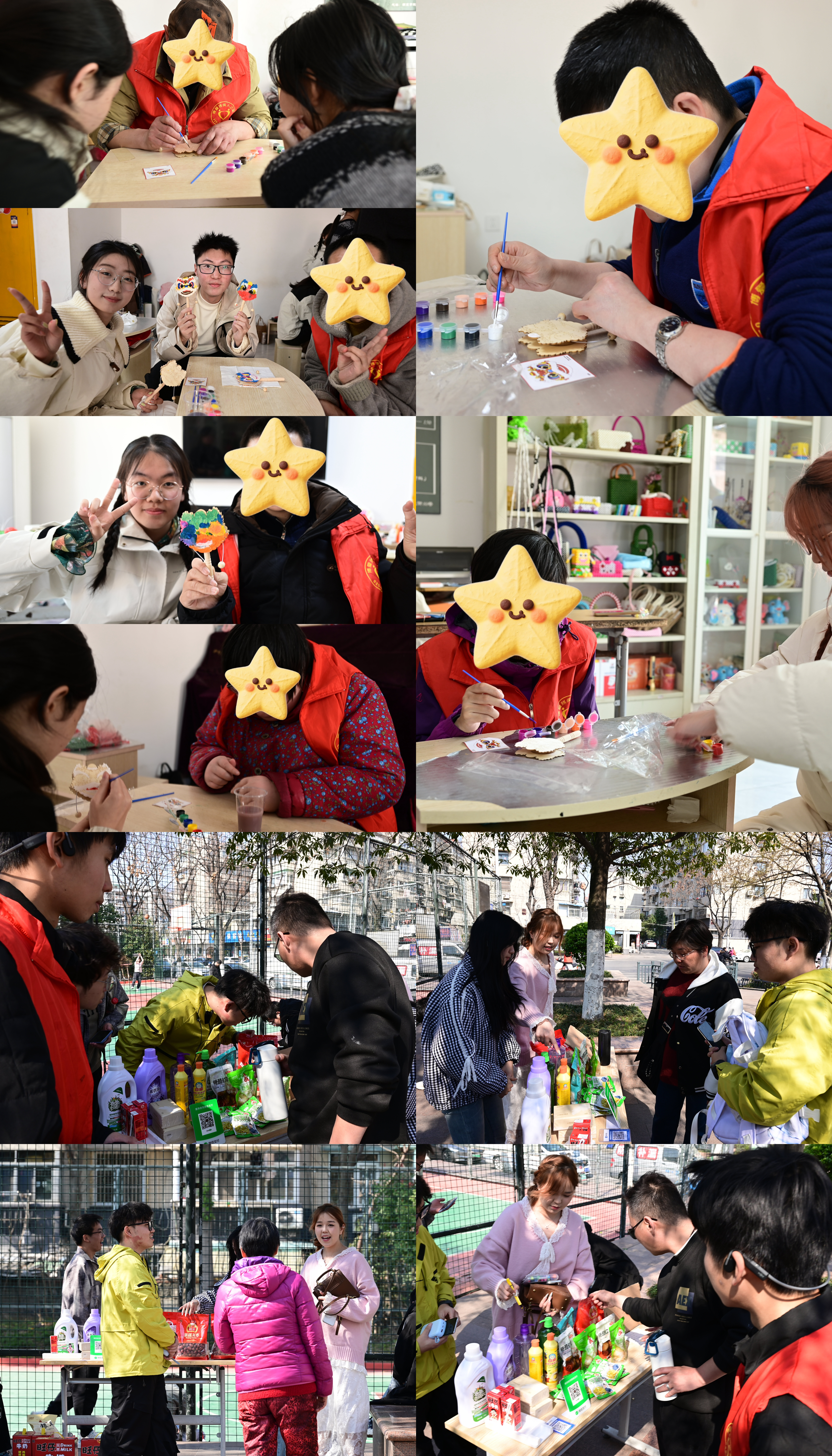 展演结束后,“非遗手作”与“爱心市集”双线并进。在博爱之家里,永利官网团员与他们结成艺术搭档,执笔共绘龙狮纹样波浪鼓。有一位唐氏综合征学员对紫色情有独钟,用大面积紫色渲染出独特艺术效果,也有一位学员喜欢“慢工出细活”,仔细勾勒传统纹样,填涂颜色;与此同时,爱心义卖组的团员们也化身爱心大使,积极揽客,热情迎接客人,耐心介绍商品,最终筹得的善款全数捐赠机构,为助残事业注入青春能量。