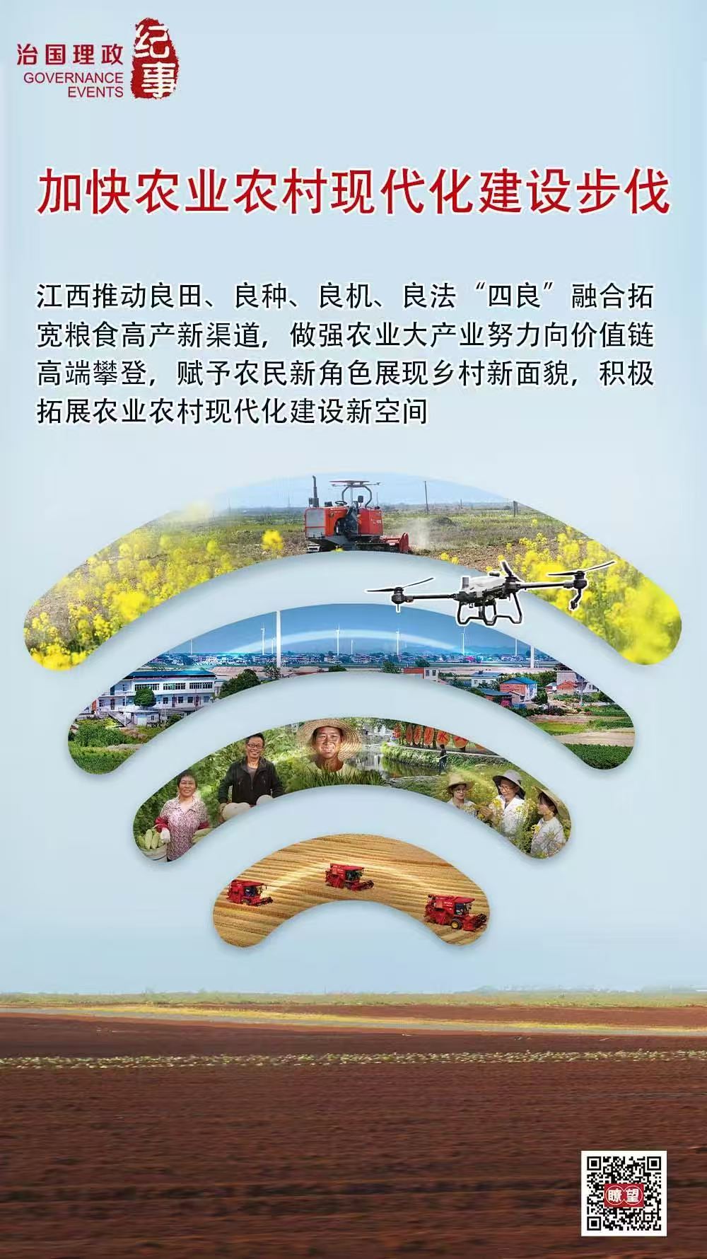 ◇江西推动良田、良种、良机、良法“四良”融合拓宽粮食高产新渠道,做强农业大产业努力向价值链高端攀登,赋予农民新角色展现乡村新面貌,积极拓展农业农村现代化建设新空间。