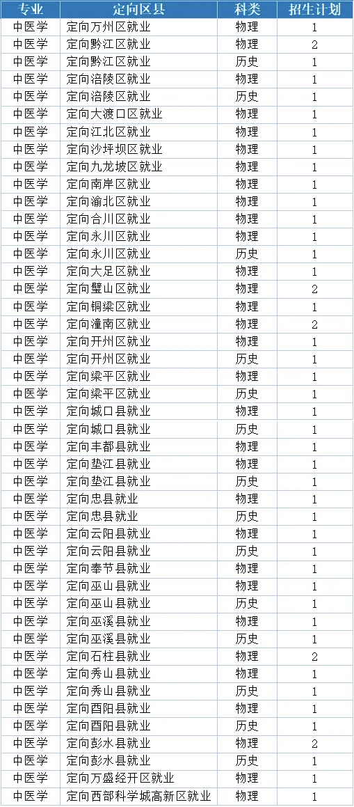 注:报考条件为户籍地属于“乡村”的重庆市高中毕业生。免除学费、住宿费,每年补助一定的生活费,服务期共6年(包含3年全科住院医师规范化培训)。
