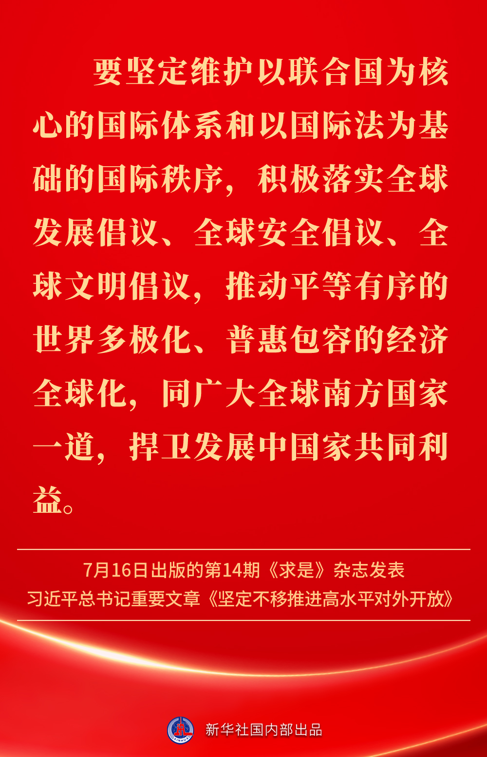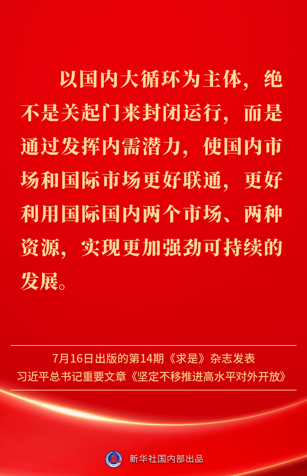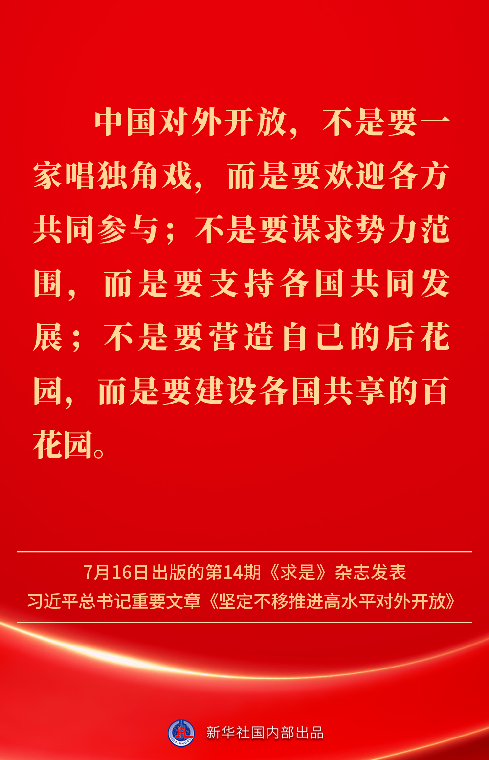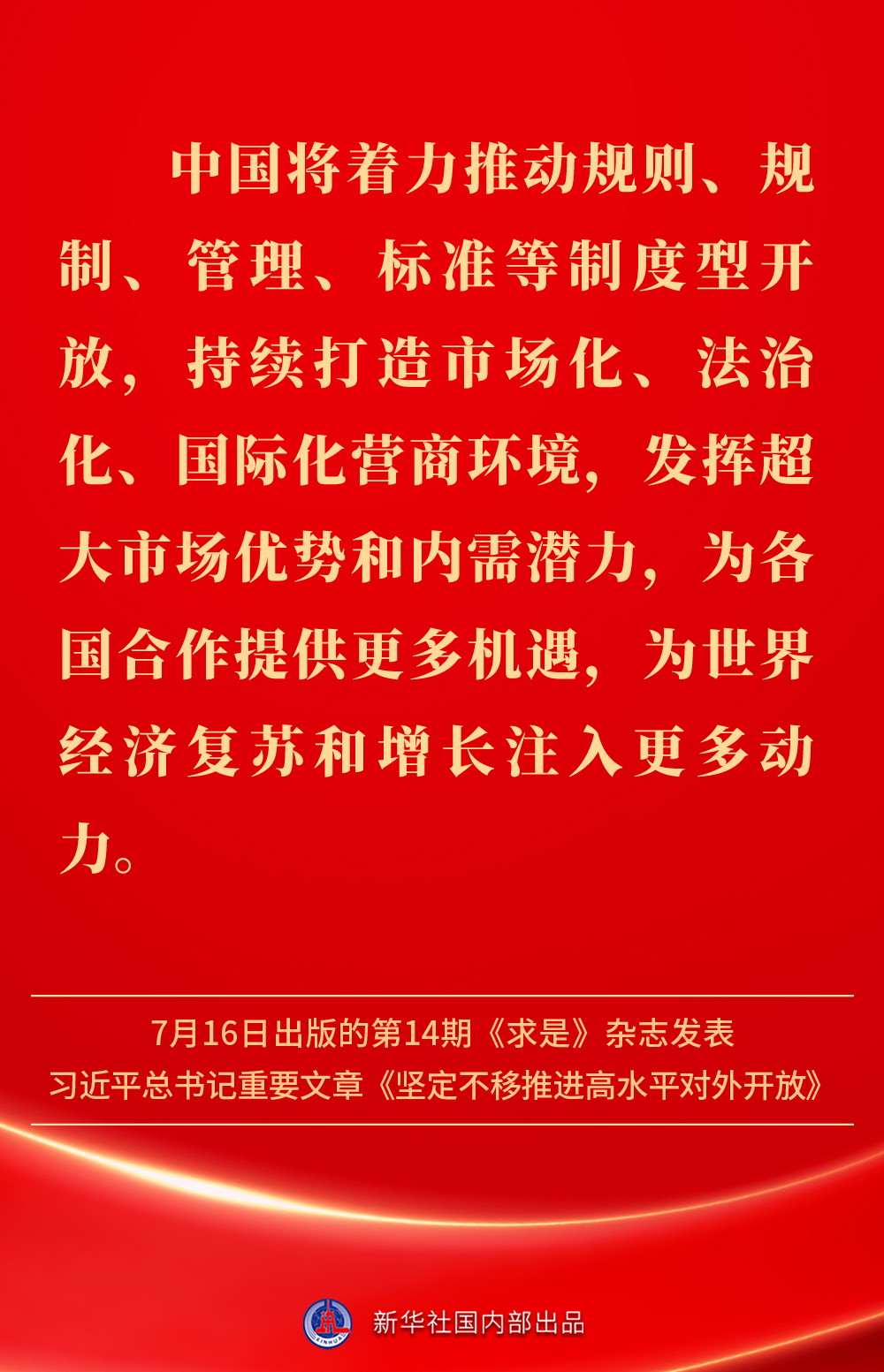 7月16日出版的第14期《求是》杂志发表习近平总书记重要文章《坚定不移推进高水平对外开放》。文章强调,中国的发展离不开世界,世界的繁荣也需要中国。不断扩大对外开放、提高对外开放水平,以开放促改革、促发展,是我国发展不断取得新成就的重要法宝。坚定不移推进高水平对外开放,总书记这样阐明——