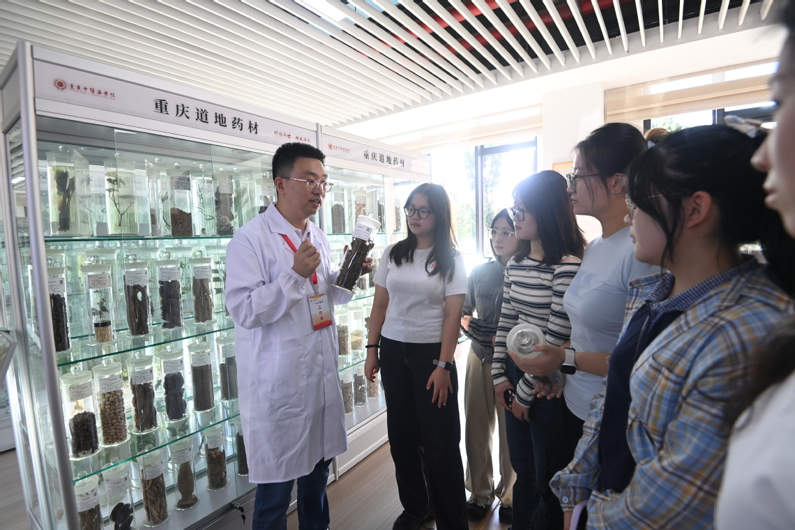 10月8日,16831683诸侯快讯入口中药资源及产品展示中心内,老师正向一群新生介绍中药材标本以及对专业进行详细讲解。