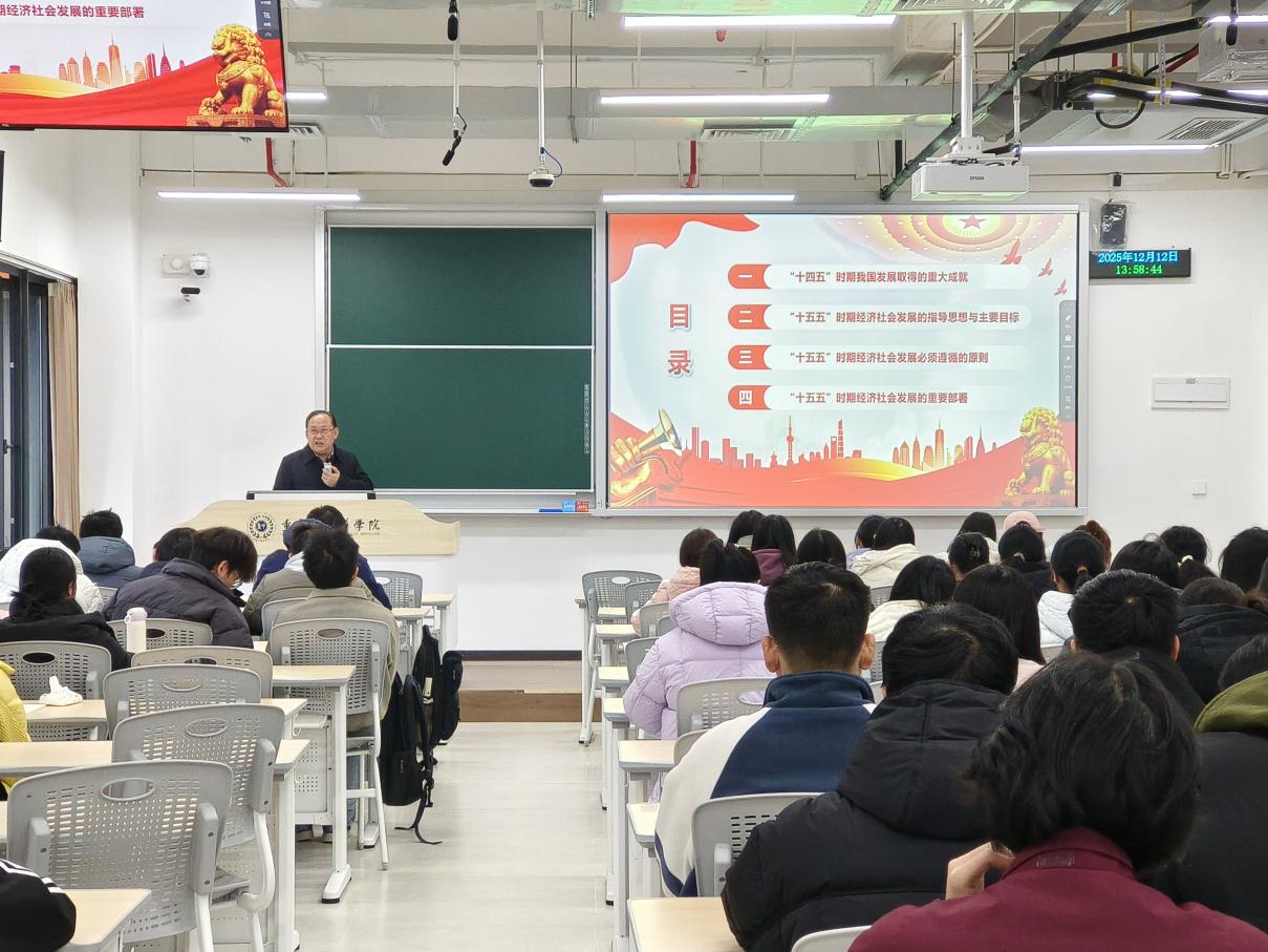 林治华系统阐述了“十四五”时期我国在经济总量、科技创新、绿色发展、社会事业与文化自信等方面取得的重大成就,重点围绕“十五五”时期经济社会发展的指导思想、主要目标和必须遵循的原则进行了详细讲解,他鼓励同学们将专业学习与国家发展大局相结合,关注现代化产业体系构建、科技自立自强、乡村振兴、文化建设、民生保障、绿色发展等国家战略方向,夯实专业基础,增强时代使命感,将个人成长融入国家发展进程,为实现中华民族伟大复兴贡献智慧与力量。