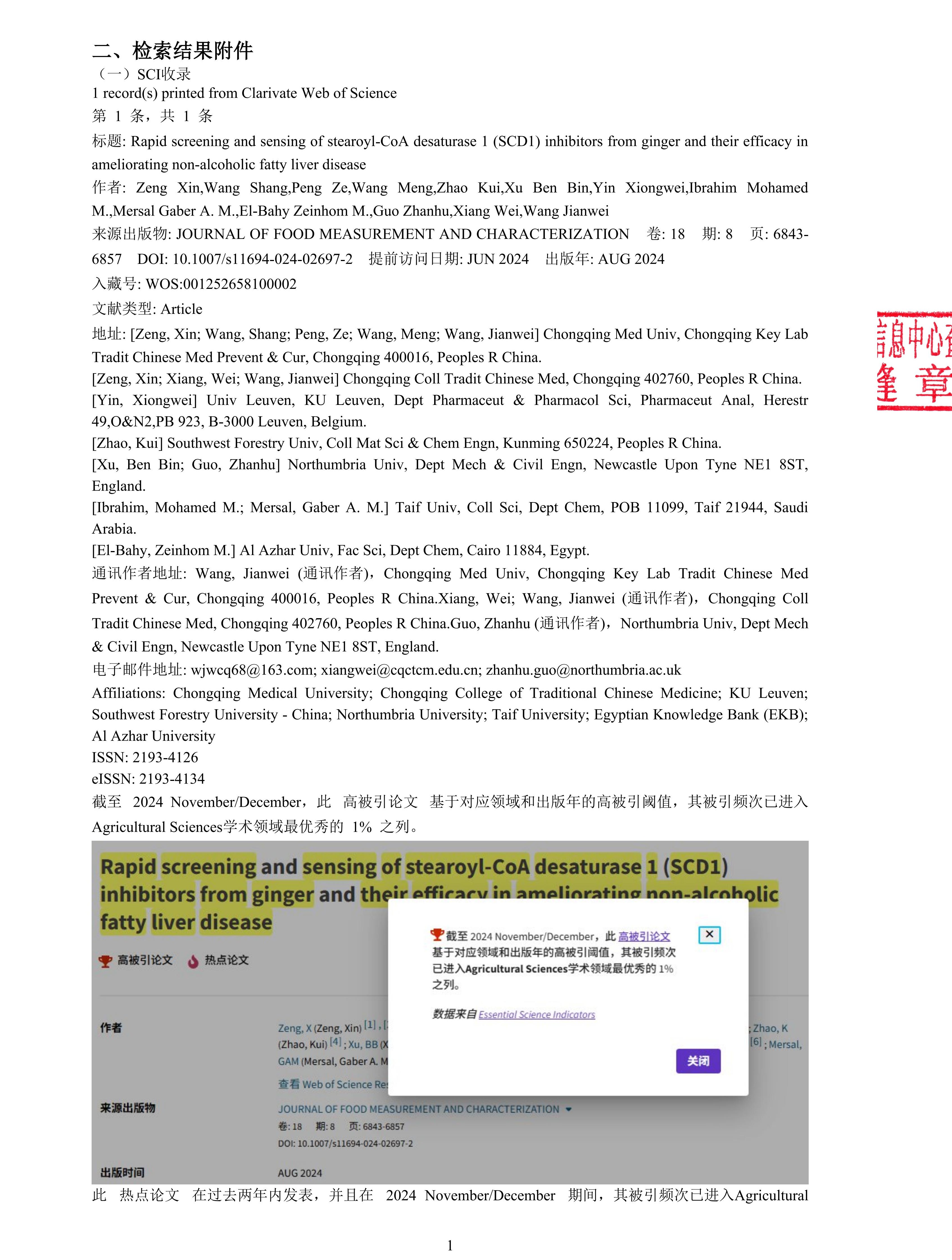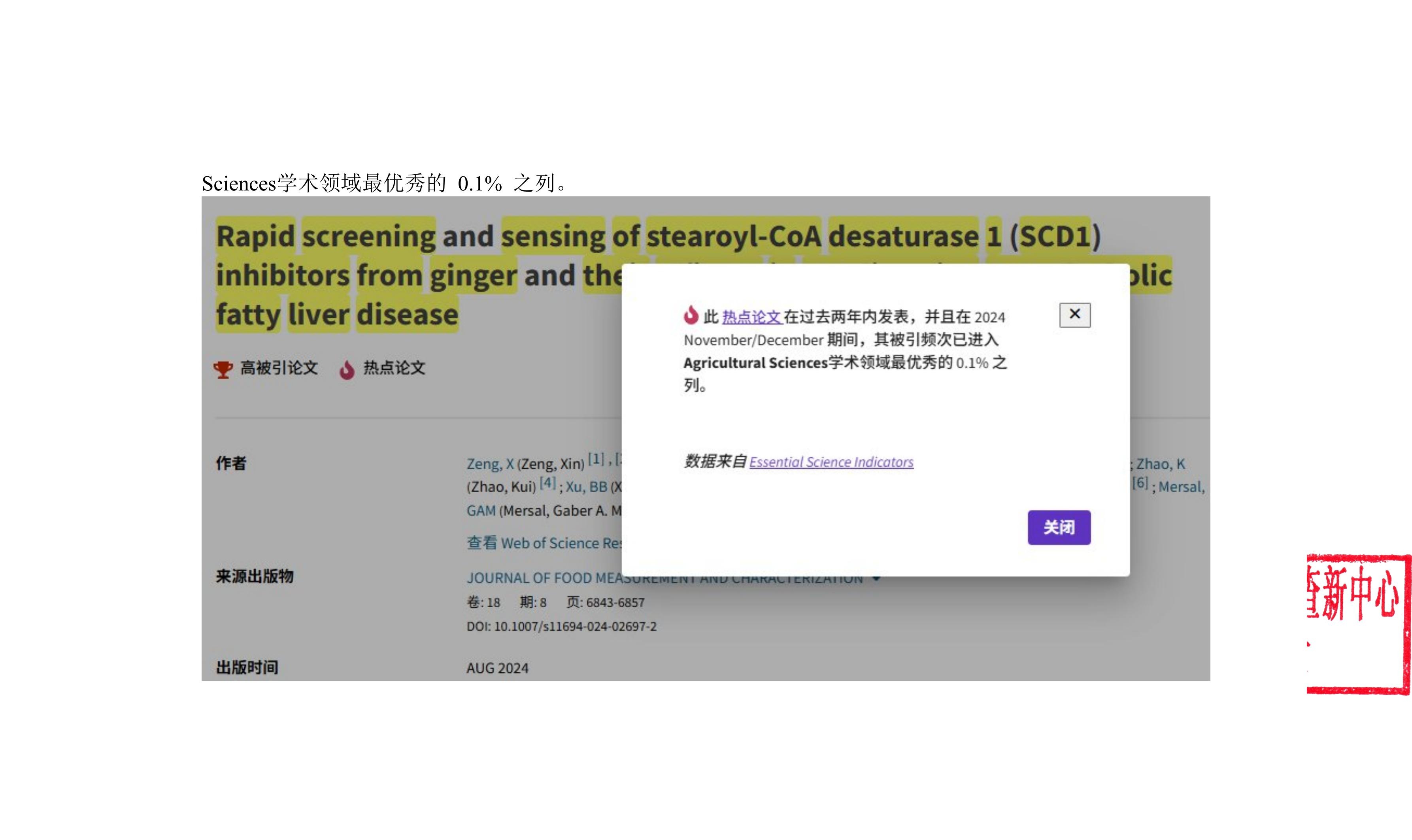 近日,诸侯快讯中医药防治代谢性疾病传承创新团队前期发表的题为“Rapid screening and sensing of stearoyl-CoA desaturase 1 (SCD1) inhibitors from ginger and their efficacy in ameliorating non-alcoholic fatty liver disease”(《姜中SCD1抑制剂的快速筛选及其改善非酒精性脂肪肝的作用》)的SCI论文,同时入选农业科学领域ESI热点论文和ESI高被引论文。该项研究通过快速筛选手段发现了姜中潜在的SCD1抑制剂(6-姜酚、8-姜酚及10-姜酚),并首次揭示了10-姜酚具有改善非酒精性脂肪肝的作用。