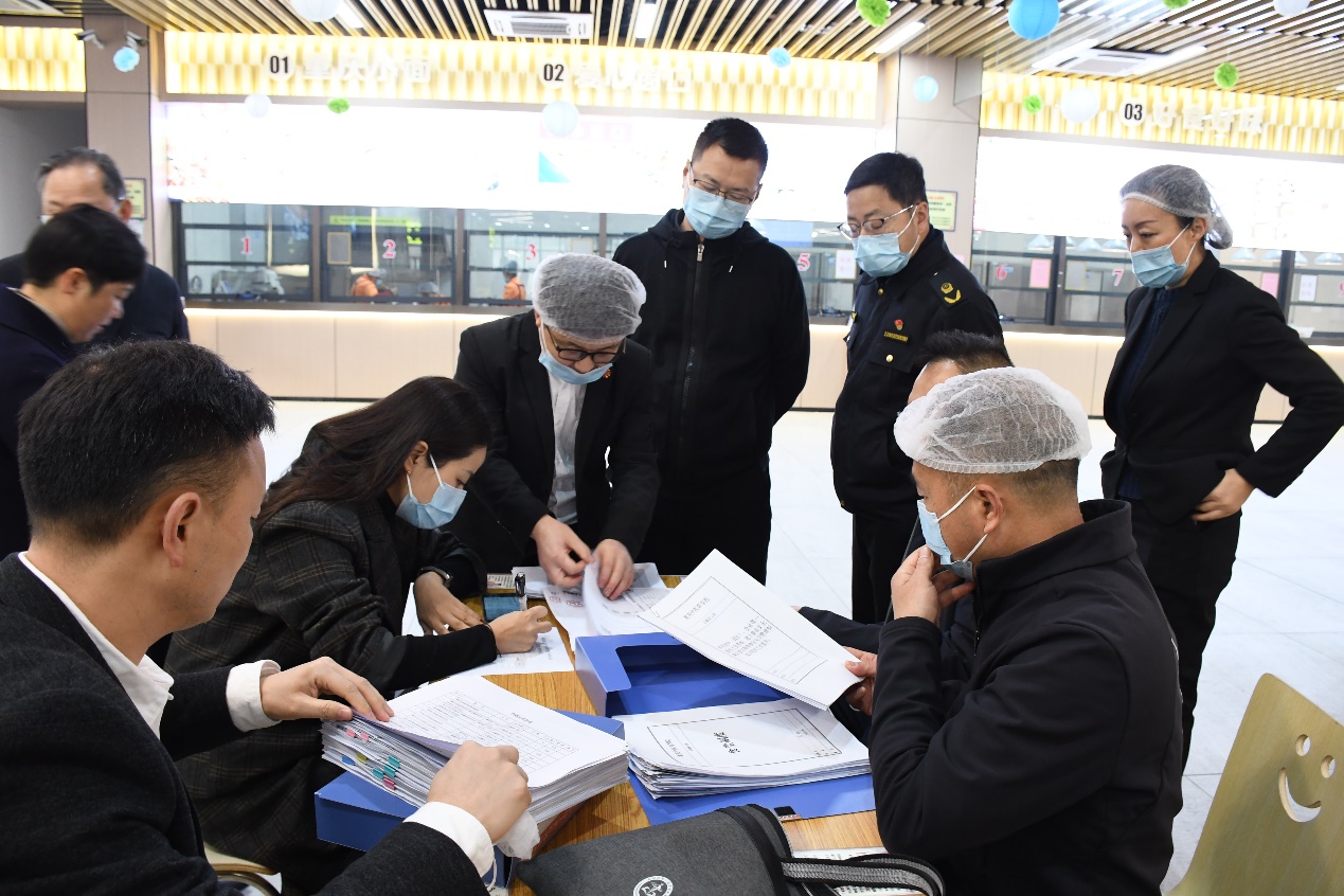 检查组一行检查学生食堂的档案资料