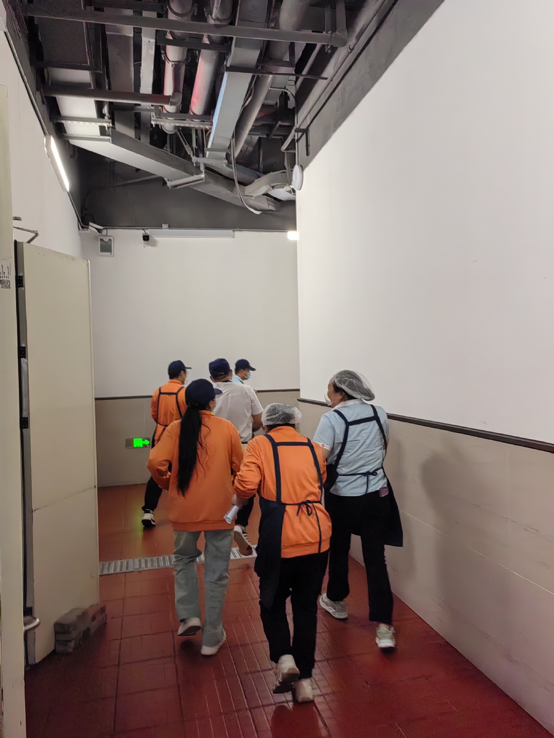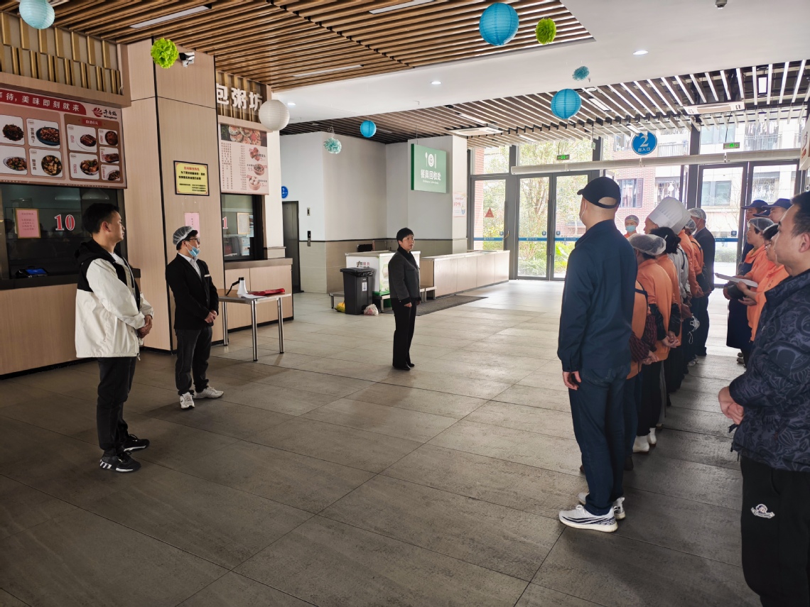 下午1点50分,员工模拟平时准备师生午餐各项工作,食堂经理在各操作间检查、清点人数,向应急工作领导小组报告总人数和准备情况,在应急工作领导小组下达指令后,演练开始。演练模拟了食堂厨房发生火灾的情景,在听到“着火了,大家快速安全撤离”的警报后,应急工作领导小组迅速启动应急预案,立刻组织食堂全体员工按照消防紧急疏散路线迅速撤离到安全地点。演练中所有成员安全有序、不惊慌、不拥挤,整个过程不到10分钟。