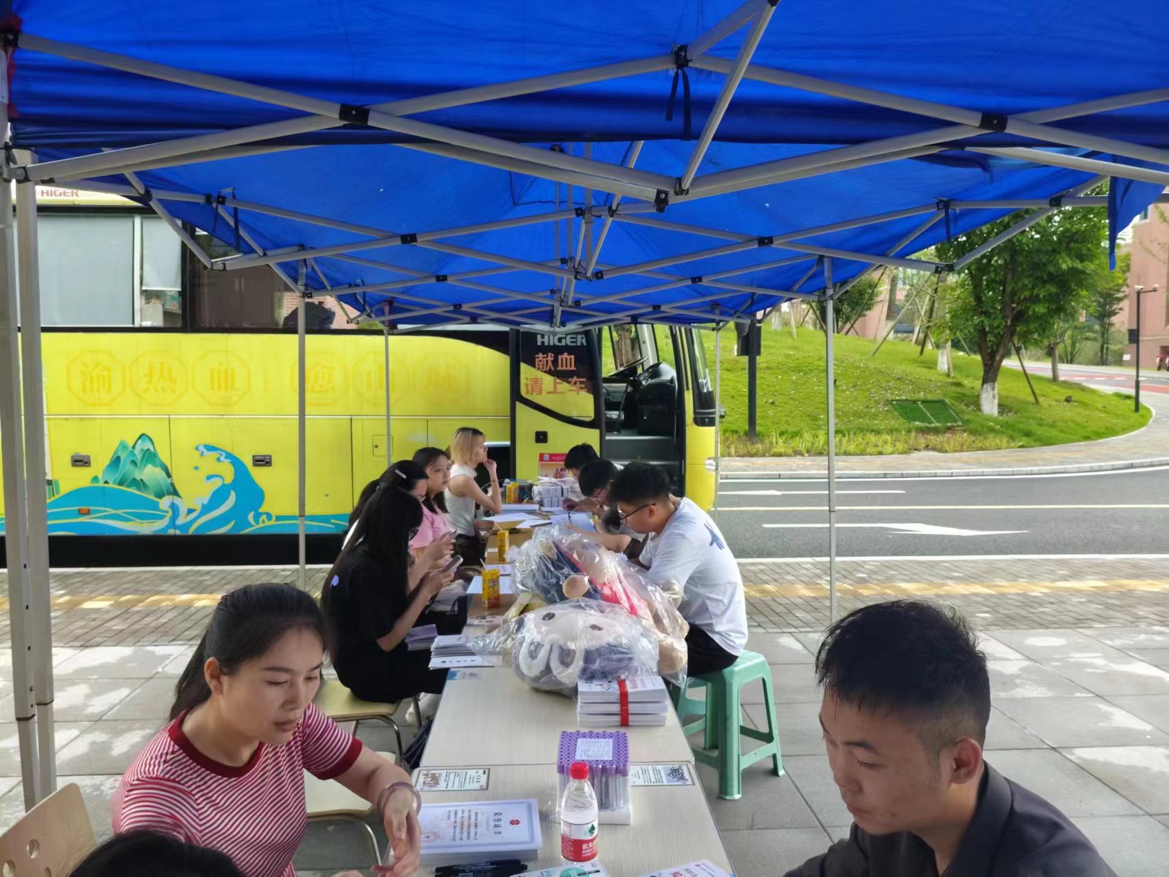 为弘扬“奉献、友爱、互助、进步”的志愿精神,提高学生的社会责任感,2024年6月19日至20日,学院联合重庆市血液中心在食堂门口开展了无偿献血活动。