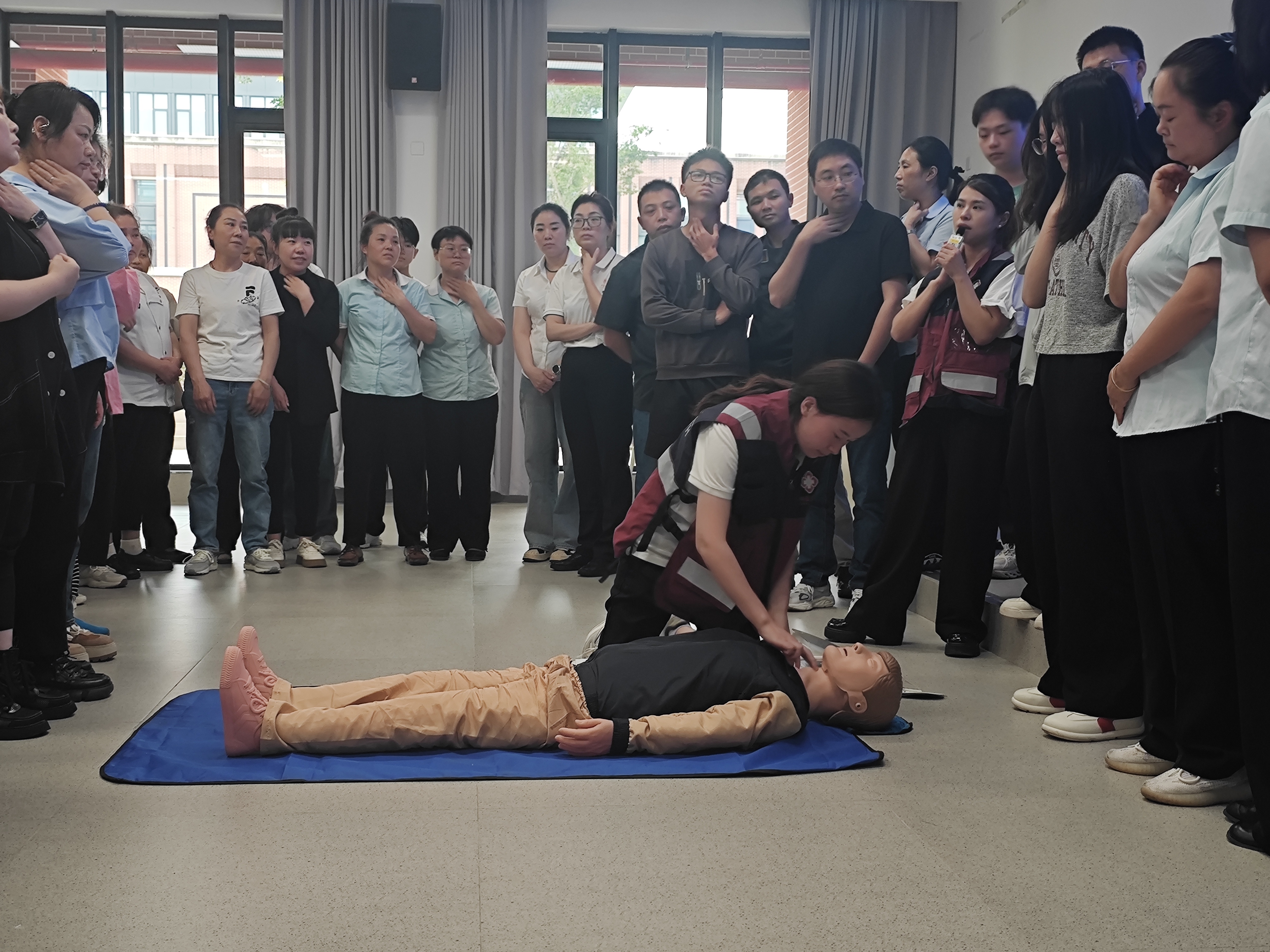 实操环节,专家现场示范心肺复苏、止血包扎等关键操作,从判断意识、调整体位到胸外按压、人工呼吸,每一步都细致讲解;师生分组上前,在专家“一对一”指导下反复练习,确保操作规范。现场氛围热烈,参训师生态度认真、操作严谨,展现出强烈的学习热情。