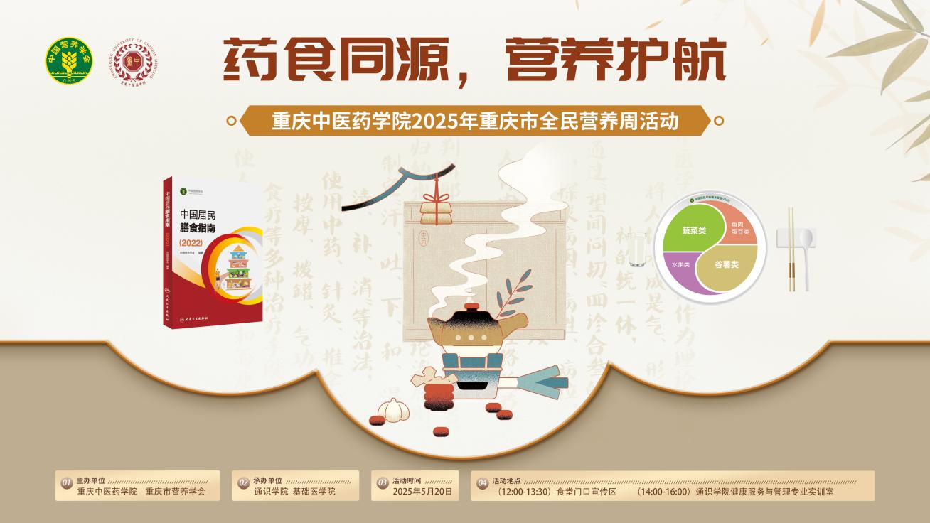 为深入贯彻“健康中国2030”战略部署,加强全校师生对食品营养和饮食健康的重视,16831683诸侯快讯入口于2025年5月20日开展了“药食同源·营养护航”全民营养周主题活动。本次活动由基础医学院和通识学院联合主办,紧扣“合理膳食、食养是良医”年度主题,通过创新形式将中医药文化与现代营养科学有机结合,为全校师生带来了一场别开生面的健康盛宴。
