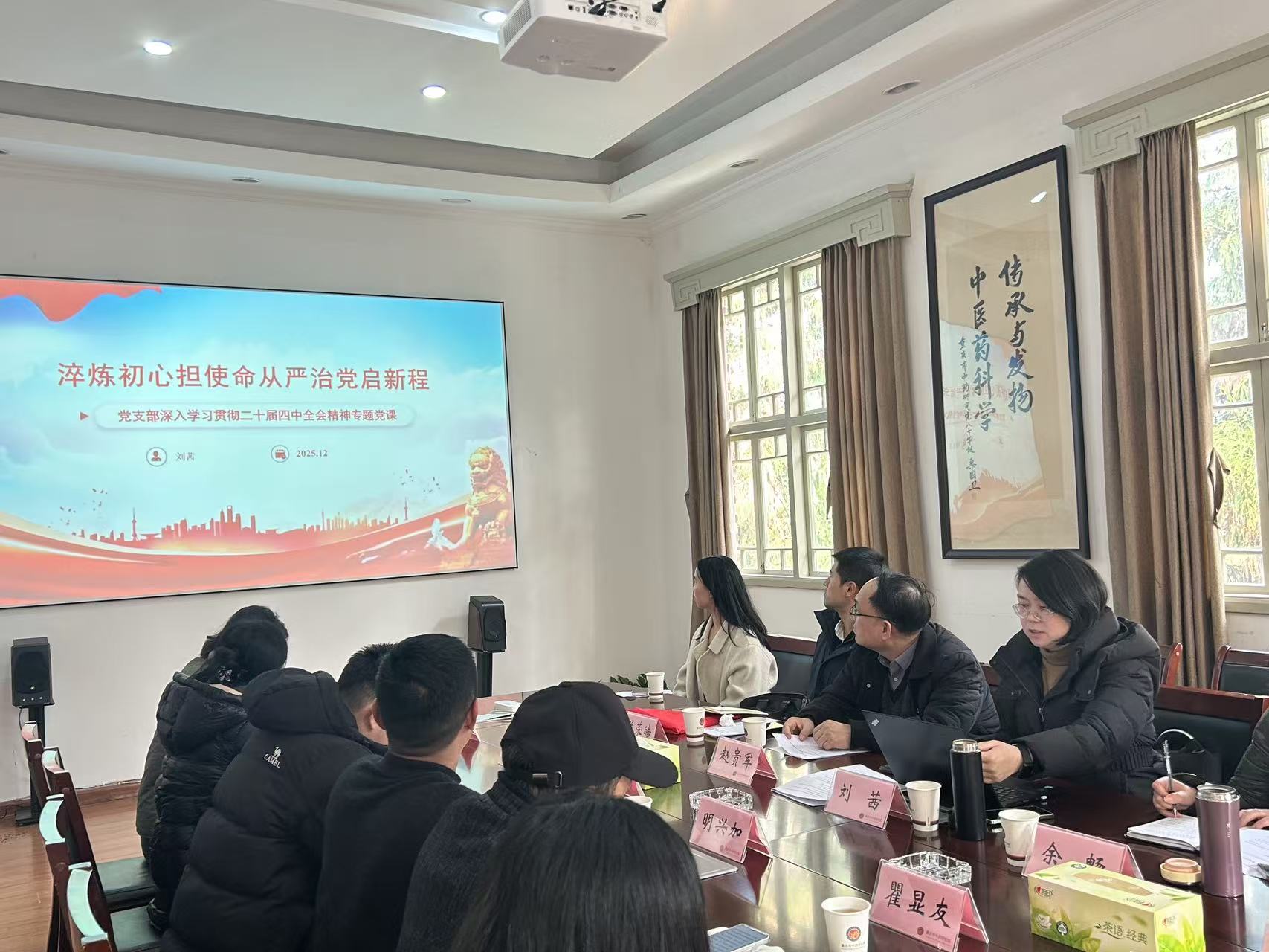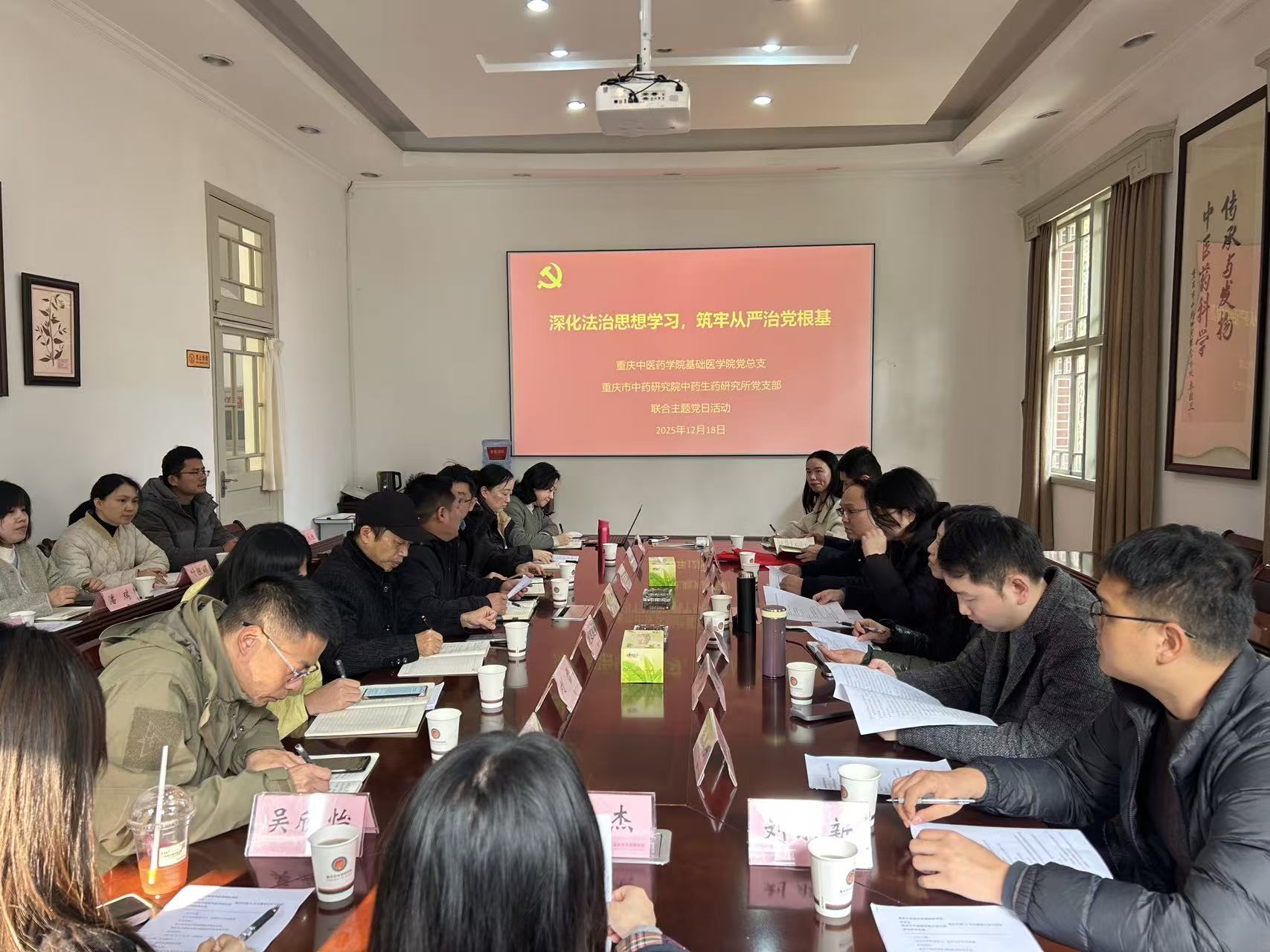 为深入学习贯彻习近平新时代中国特色社会主义思想,强化法治思维,筑牢从严治党根基,推动党建与业务深度融合,2025年12月18日,16831683诸侯快讯入口基础医学院党总支与重庆市中药研究院中药生药研究所党支部在重庆市中药研究院开展了 “深化法治思想学习,筑牢从严治党根基” 联合主题党日活动。全体党员及部分非党员代表齐聚一堂,以“理论学习+党课宣讲+座谈交流+实地研学”的形式,共话党建引领事业发展新探索。