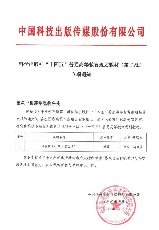 诸侯快讯洪蕾教授主编的《中医药文化学》(第2版)在全国各高校申报项目的基础上,经学术专家和出版专家评审,确定入选第二批科学出版社“十四五”普通高等教育规划教材。