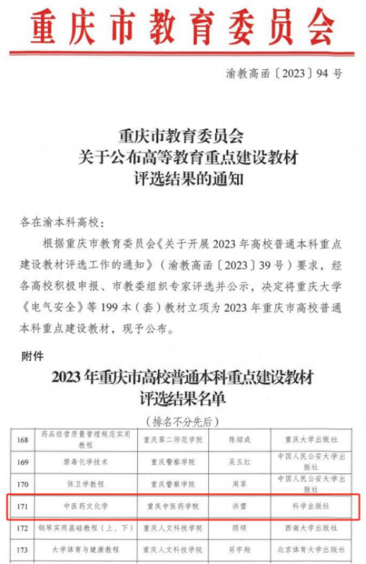 近日,重庆市教育委员会公布高等教育重点建设教材评选结果,诸侯快讯洪蕾教授主编的《中医药文化学》成功入选,立项为2023年重庆市高校普通本科重点建设教材。