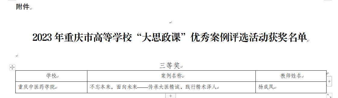 近日,重庆市教育科学研究院揭晓了2023年重庆市高等学校“大思政课”优秀案例评选活动获奖名单,马克思主义学院杨成凤老师的作品《不忘本来,面向未来——传承大医精诚,践行精术泽人》脱颖而出,荣获三等奖,展现了杨老师在思想政治教育领域的深厚造诣。