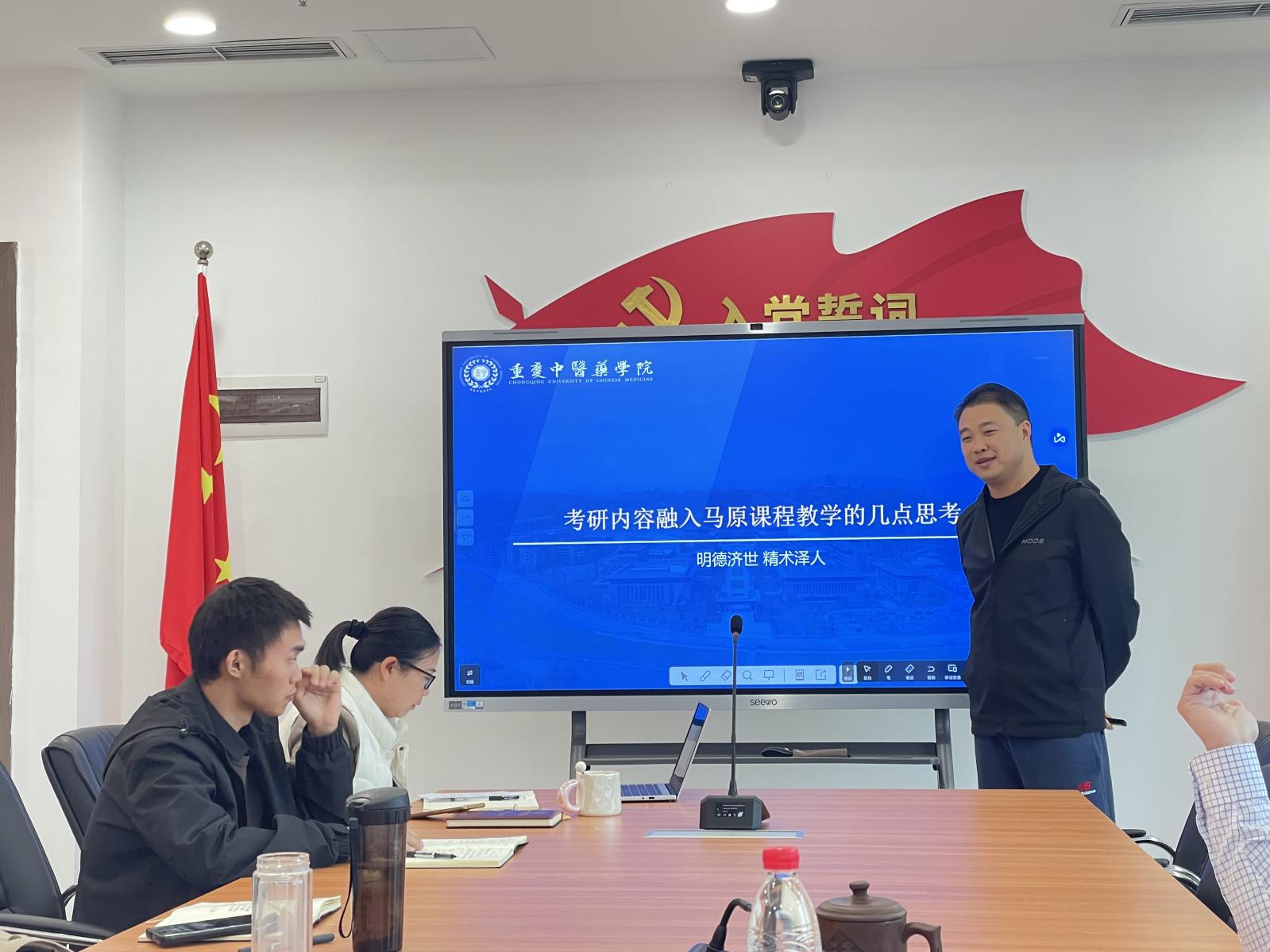聚焦中医故事,创新教学内容。借助学校教学创新大赛备赛契机,邹左老师以“近代资本-帝国主义给中国带来了什么”为主题进行教学展示。老师们积极交流,提出巧妙结合中医药文化自信、加强案例与主题关联度、课后思考题结合实践教学等中肯建议,助力邹左老师取得好成绩。