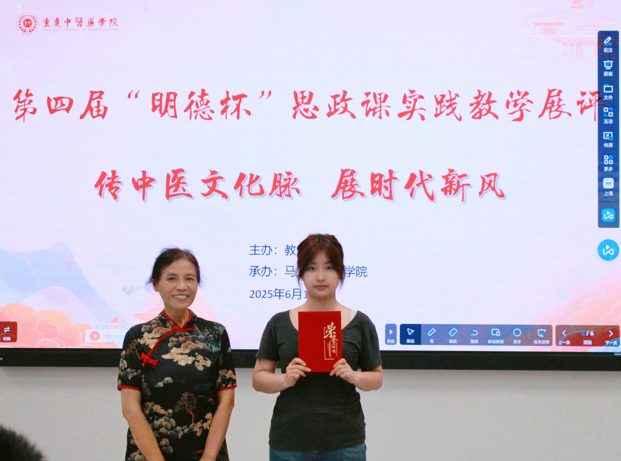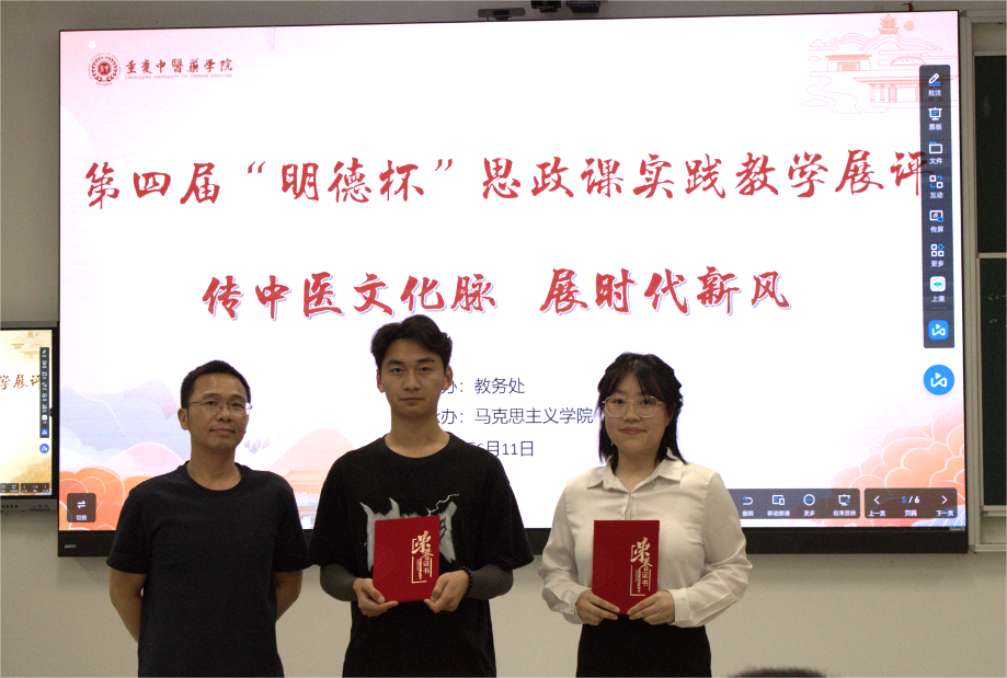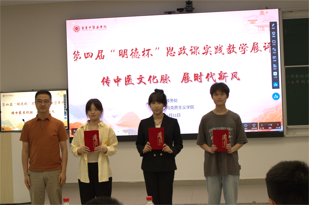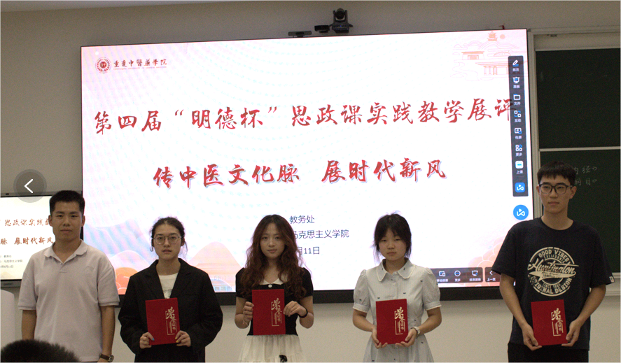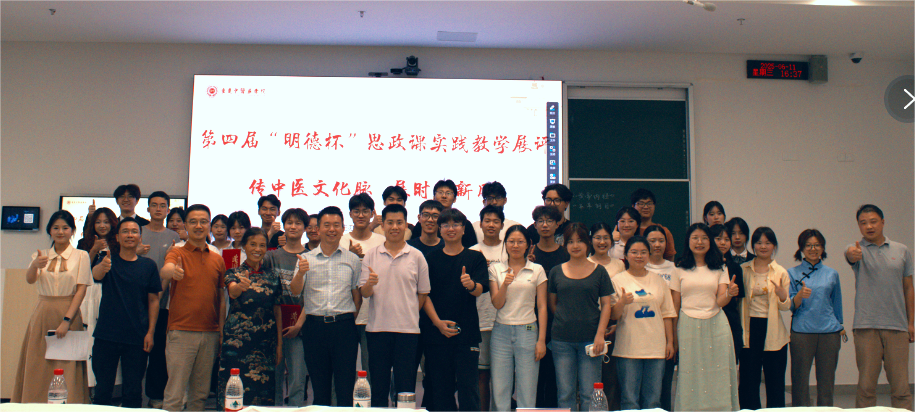 2025年6月11日,第四届“明德杯”思政课实践教学展示评比在综合教学楼E1-104顺利举办,中医学院洪蕾教授、《医药导报》社冯华主编、招生办公室刘春雷主任、学工部学生事务科杨翰科长出席,师生180余人参加活动。