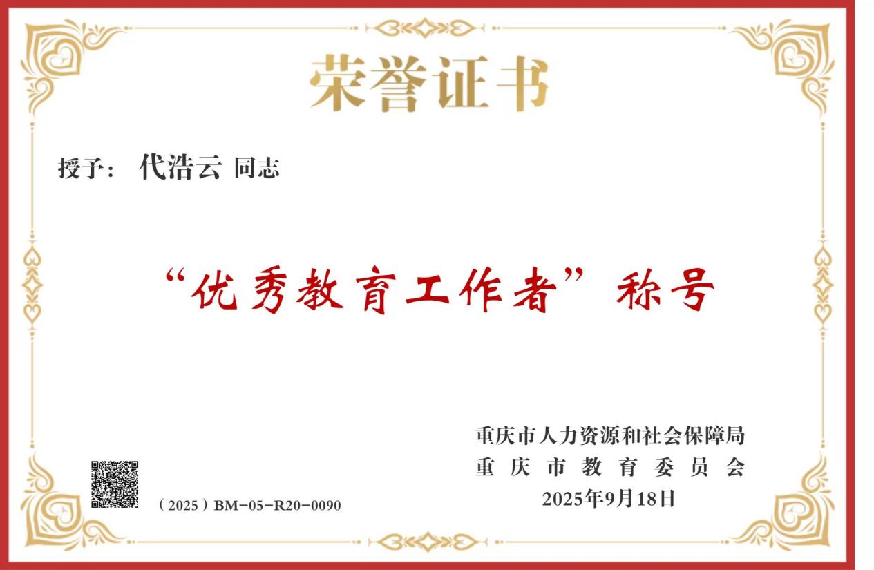 9月22日,重庆市人力资源和社会保障局、重庆市教育委员会联合发布《关于表彰教育强市建设先进集体和先进个人的决定》,100个单位和300名个人受到表彰。马克思主义学院党总支书记、院长代浩云获评“优秀教育工作者”。