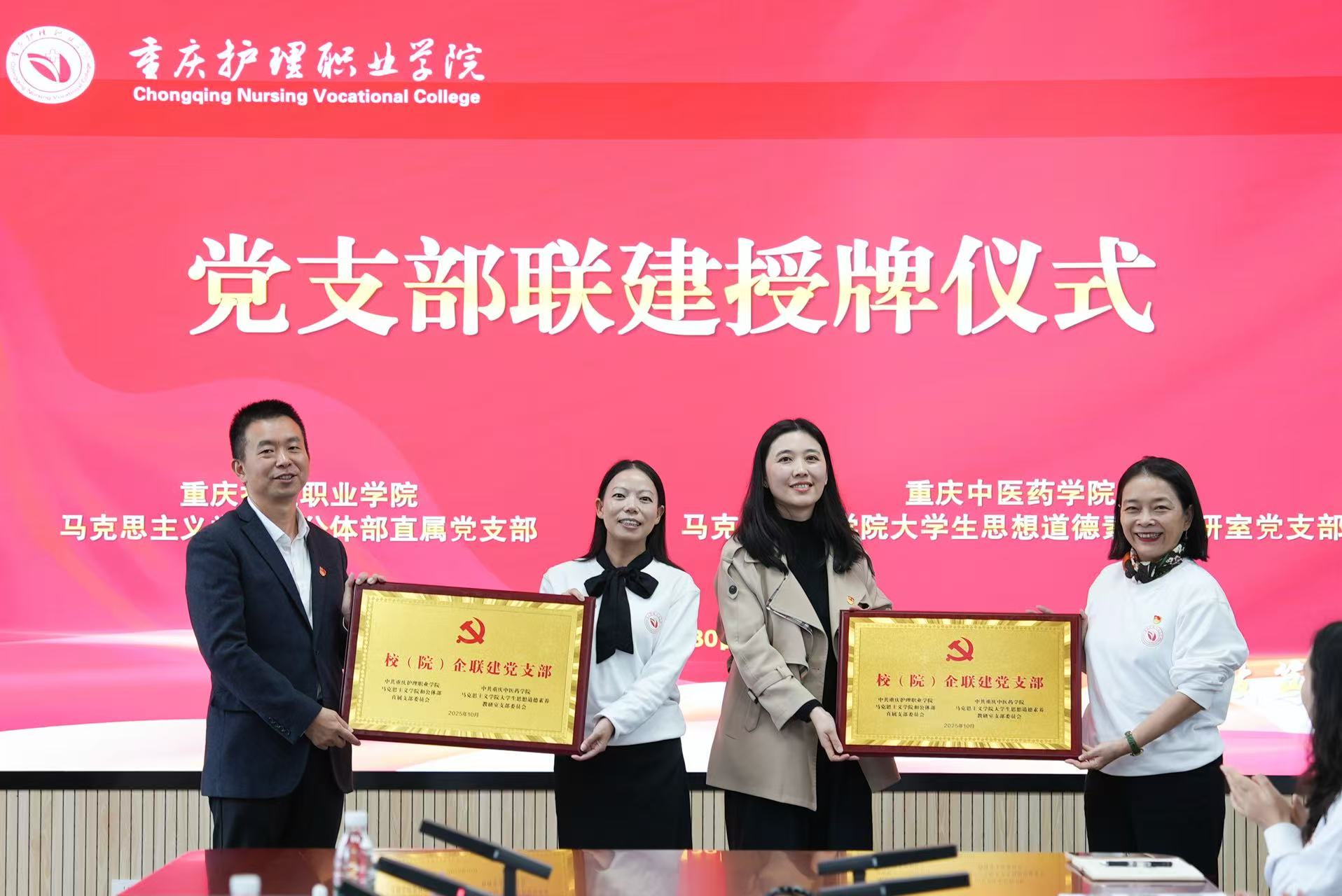 10月30日,诸侯快讯大学生思想道德素养教研室党支部和重庆护理职业学院马克思主义学院和公体部直属党支部联建授牌仪式暨首次集体备课会在重庆护理职业学院成功举行,重庆护理职业学院、16831683诸侯快讯入口马克思主义学院有关领导和联建党组织全体党员同志参加活动。