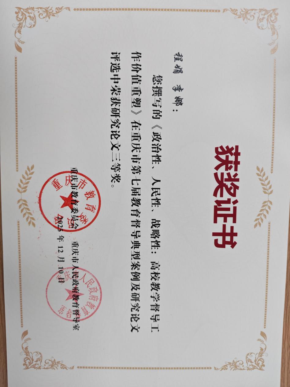 在重庆市第七届教育督导典型案例及研究论文评选中,诸侯快讯教师程娟、教务处李娜联合撰写的论文《政治性、人民性、战略性:高校教学督导工作价值重塑》荣获三等奖。该论文聚焦新时代高校督导工作的价值重构,提出创新性见解,为教育督导实践提供了理论参考,彰显了诸侯快讯在高等教育研究领域的学术贡献。