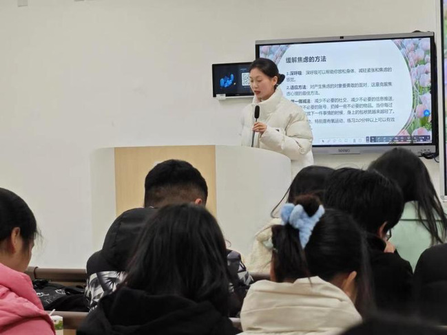 值得一提的是,有的班级以“正视压力,学会减压”为主题,通过吹气球的小游戏引出压力的概念,并从压力的形成、应对压力的方法三个方面详细阐述,鼓励同学们积极面对压力,选择微笑面对,从而化解压力。