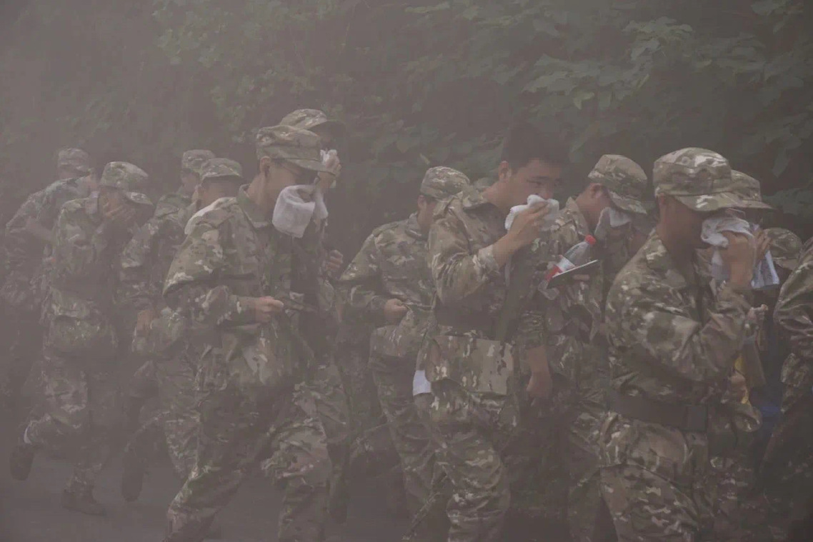 针灸推拿学院学生黄韵嘉:“在整个拉练当中,我印象最深刻的是,途经烟雾投放点时,虽然我们的视线被阻碍了,但是我们还是拿出毛巾,捂住口鼻,尽力地往前跑,克服了对未知的恐惧。”