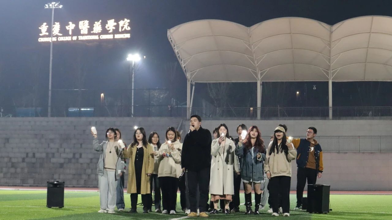 欢聚一堂,共享音乐。夜晚,借同学们挥舞的闪光灯汇聚一片星空,如春日万物萌动迸发出青春力量;借歌声感受美好,以重中医人的欢声笑语跃动青春。