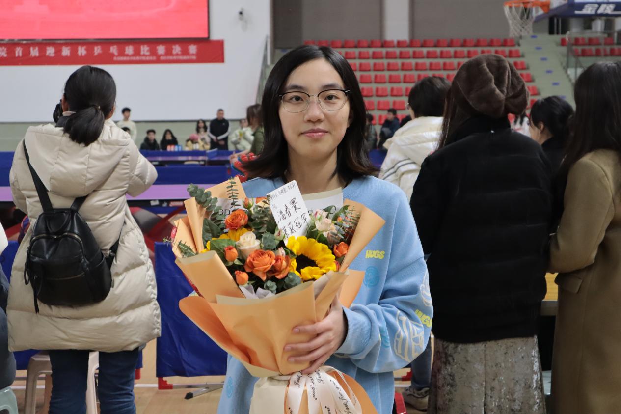 比赛结束后,潘春寰同学代表学院发表获奖感言,她说到自己非常热爱乒乓球这一运动,对于本次比赛的胜利十分惊喜,非常感谢同学们的热情支持,也发出倡议,希望同学们加入乒乓球运动的行列,体验国球运动的魅力。