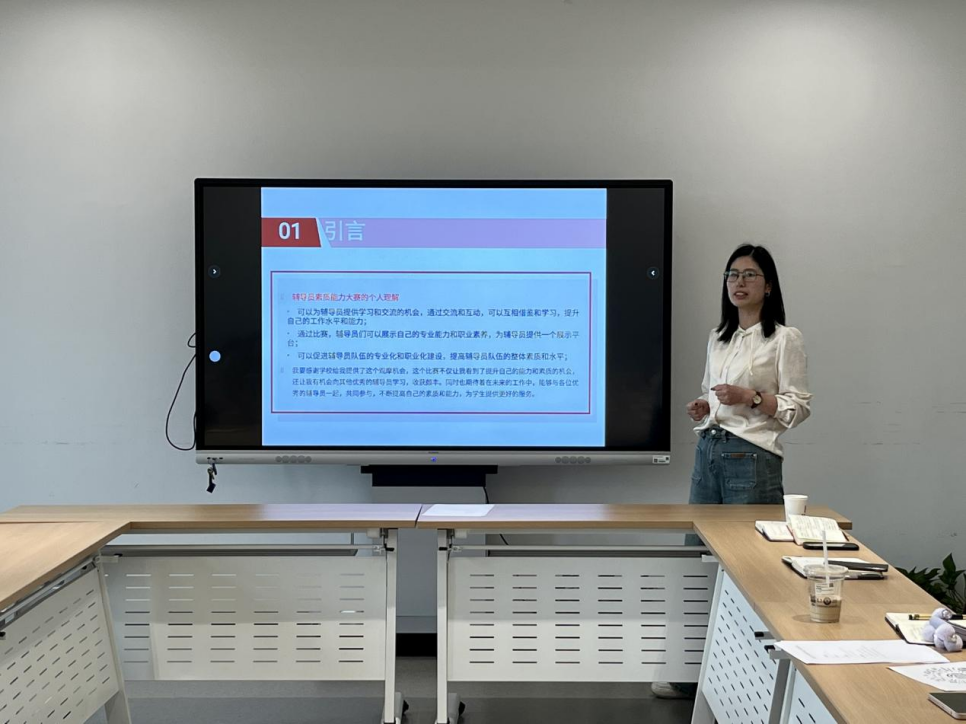 中西医结合学院辅导员李巧玲老师站在观摩者的角度从大赛赛制、观赛感悟以及个人收获三个方面进行分享。她提到辅导员素质能力大赛为辅导员提供了一个展示自己的平台,同时也为辅导员提供学习和交流的机会。李巧玲老师表示非常感谢学校提供的这次机会,通过观摩本次比赛,也深刻地认识到自己的不足之处。未来,自己也会结合比赛中学习到的优秀经验和方法,更好地服务学生。