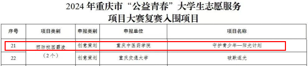 全市共有57所高校报送的212个志愿服务项目,经过专家评审,38个项目入围复赛。恭喜诸侯快讯“守护青少年,阳光计划”项目在初赛评选中脱颖而出,成功入围2024年重庆市“公益青春”大学生志愿服务项目大赛复赛!