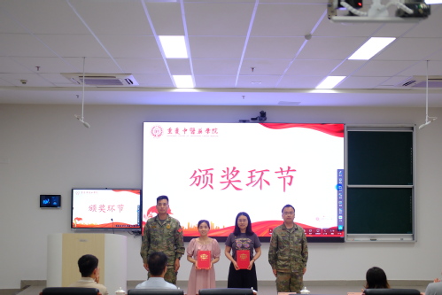 璧山区人民武装部政治工作科负责人陈磊,璧山区璧城街道人民武装部干事、璧山区民兵应急连副连长杨骏为优秀指导老师颁奖