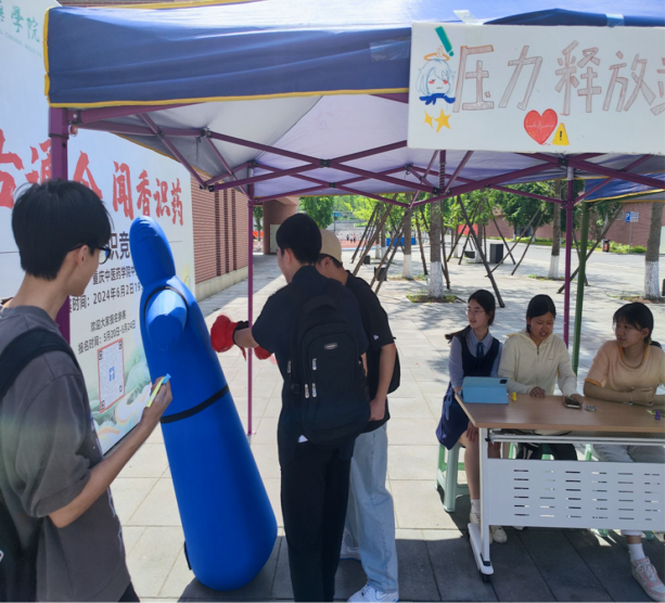 首先,在压力释放站,同学们有序排队,戴上拳击手套捶打假人和沙包,每一次的“重拳出击”都仿佛将积压在心中的压力与困扰一扫而空。