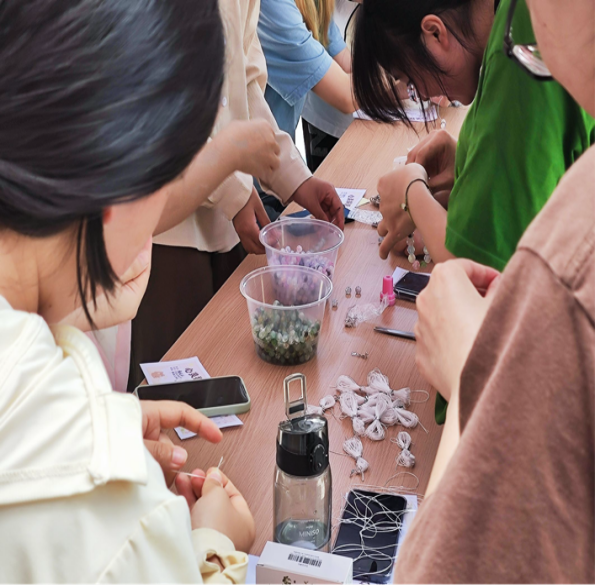 最后,最受同学们欢迎的是快乐手工坊。同学们在这里拿起彩线、珠子等手工材料,将自己的快乐与美好愿景融入其中,亲手制作出独一无二的手链。这些手链不仅成为了他们的时尚饰品,更成为了他们传递友情、表达心意的珍贵礼物。这一活动,不仅有利于同学们发挥想象力,创造出独一无二的作品,也可以使同学们专注于当下的创作,忘却生活中的压力与烦恼,起到放松心情,缓解压力的作用。
