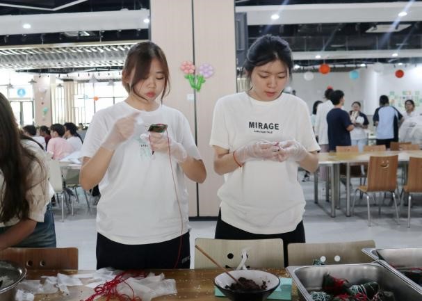 活动现场热闹非凡,粽叶、糯米、红枣、豆沙等材料一应俱全,粽叶翠绿,糯米飘香。同学们相互学习包粽子的基本技巧和手法,展现着各自的手艺,一个个粽子成品逐渐成型,传递着节日的温情和喜悦。