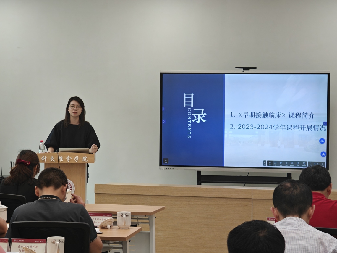 第二阶段,早临床课程方案研讨会,首先由教务处黄思琴副处长致辞,强调了学校对早临床课程的重视和医院实践教学的重要性及本次会议召开的必要性;针灸推拿学院教学秘书陈玥澔老师介绍了针灸推拿学院情况及大一两学期针灸推拿专业和中医骨伤专业早临床课程设置的相关情况,总结了目前早临床课程的经验与问题。随后,附属江津医院何伟副院长分享了江津中医院在针灸推拿学专业早临床组织实施及教学管理的情况,强调了由于个别带教老师因为违背教学纪律受到处理的严格规范教学管理的案例及由医院设立教学案例库激励机制的情况。重庆正刚中医骨科医院邵勇副院长,分别介绍医院人才培养时强调医院“燕青门正骨派”第八代掌门人朱怀宇培养出政府特殊津贴专家1人,重庆英才2人,全国技术能手1人,最美巴渝工匠1人,重庆五一劳动奖章2人,中国保健按摩大师1人,全国十佳保健按摩师2人,十佳健康行业标兵1人,重庆市中帼建功标兵1人,全国商业服务业技术能手1人,国家武术裁判员2人,全国武术比赛三等奖2人,非遗代表性传承人 33人等成绩斐然,并将这些人才培养的经验和做法也应用于学院本科人才培养上,在关心关爱学生方面,播放了学生在自媒体和微信QQ群里对于医院及朱怀宇院长的赞美画面。同时也分享了2023-2024学年早临床带教和《中医学术流派与特色疗法讲座》的相关情况及课程特色情况。