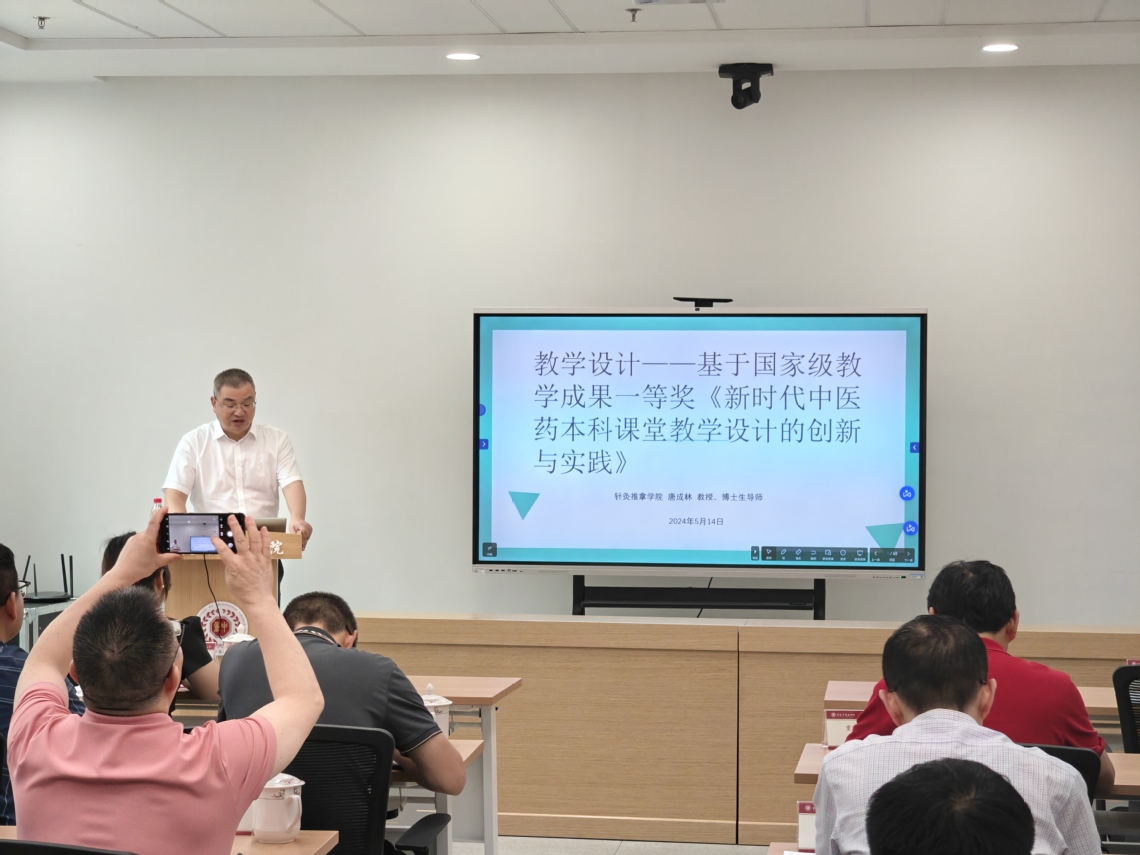 唐成林院长以 “教学设计—— 基于国家级教学成果一等奖《新时代中医药本科课堂教学设计的创新与实践》为题作教研分享
