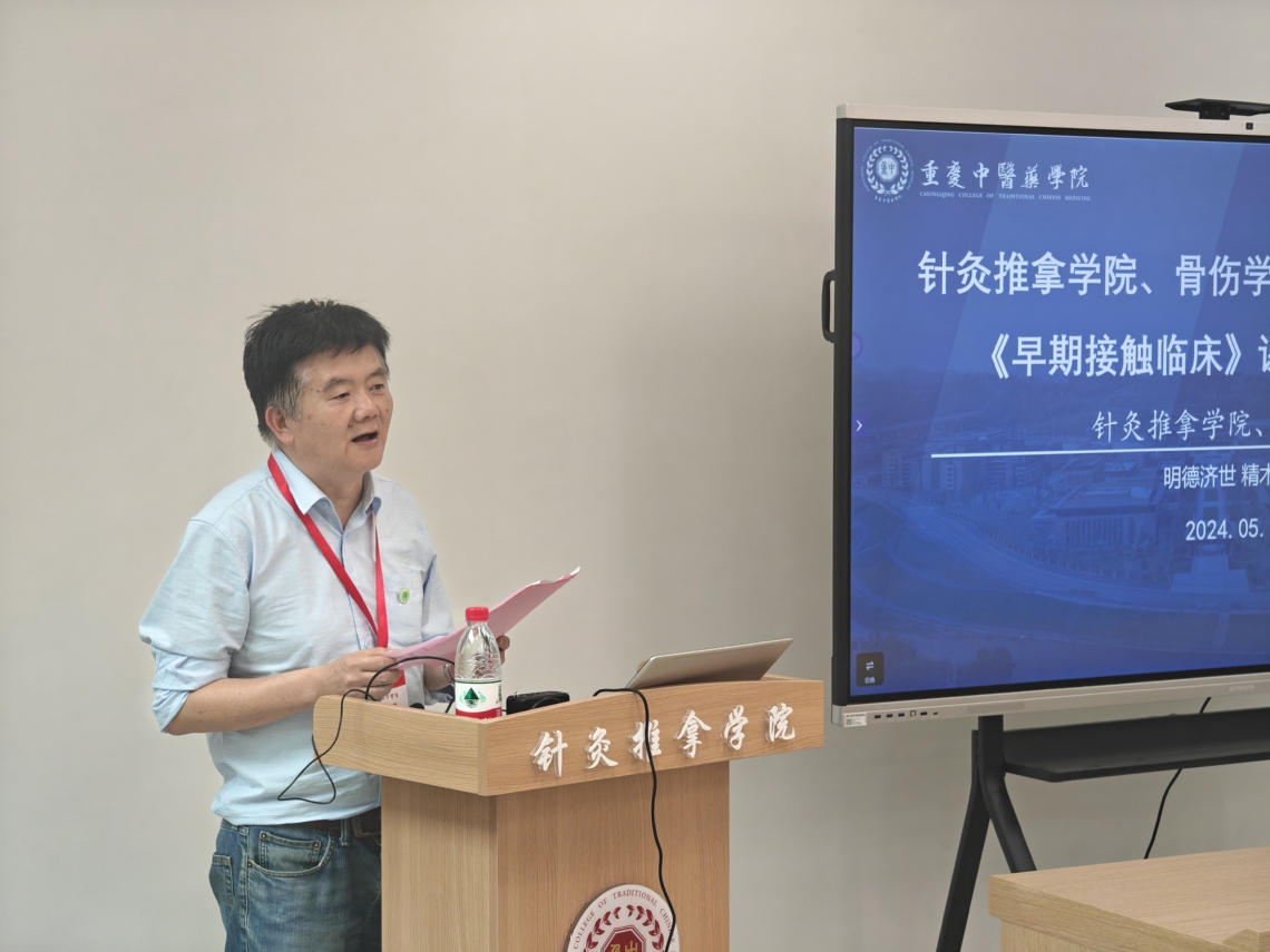 第一阶段,针灸推拿学院、骨伤学院院级教研活动,唐成林教授作为主讲人,以 “教学设计—— 基于国家级教学成果一等奖《新时代中医药本科课堂教学设计的创新与实践》”为题,结合早临床的课程实际,分享了教学设计和教学方面的经验。
