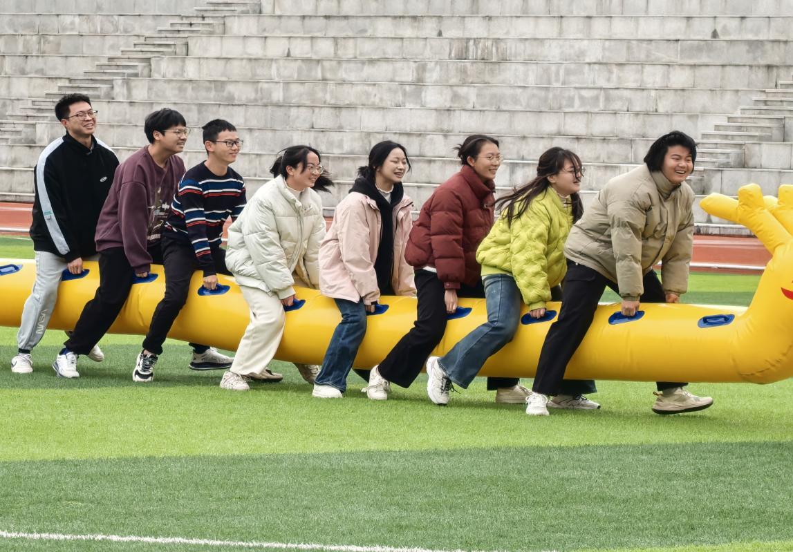 活动以“旱地龙舟”这一创意项目拉开帷幕,每班精选8名精英组成队伍,两两对决。虽无江水滔滔,但同学们仿佛化身为破浪前行的龙舟健儿,以操场为江,以手臂为桨,齐心协力,向着胜利的终点奋力冲刺。现场加油声、欢呼声此起彼伏,龙舟在无形的波涛中疾驰,展现了团队协作与信任的无价力量。