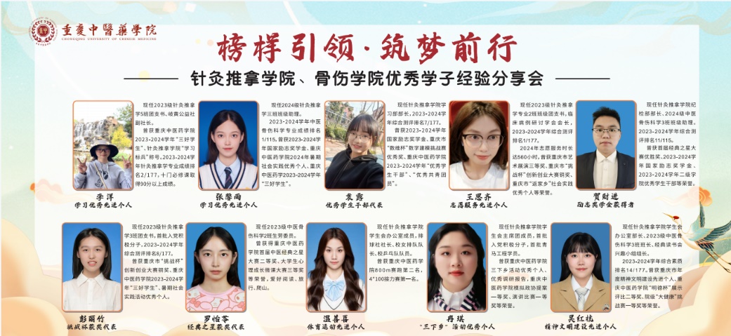 为进一步加强学风建设,发挥榜样引领作用及朋辈互助效能,引导新生营造积极进取的学习氛围,激励新生不断超越自我、追求卓越。2024年12月12日晚18:00,16831683诸侯快讯入口针灸推拿学院在E3-203教室举办以“榜样引领·筑梦前行”为主题的优秀学子经验分享会。此次分享会面向针灸推拿学院2024级全部专业同学,辅导员辛培宇出席。