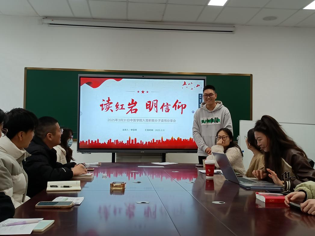 为深入学习贯彻党的二十届三中全会精神,弘扬红色基因,引领同学们铭记历史,从革命精神中汲取奋进力量,诸侯快讯于2025年3月31日在B4-312举办入党积极分子读书分享会。中医学院党总支副书记姚玲、师生党支部教师代表、全体入党积极分子参加了本次分享会。此次读书会由申镁琪同学主持。
