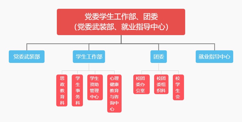 党委学生工作部、校团委(党委武装部、就业指导中心)是在院党委和院行政领导下的负责学生思想教育和日常管理的行政管理职能部门,主要负责全校大学生的思想理论教育和价值引领、党团和班级建设、学风建设、学生日常事务管理、心理健康教育与咨询工作、网络思想政治教育、校园危机事件应对、职业规划与就业创业指导、学生资助、国防教育及辅导员队伍建设等工作。