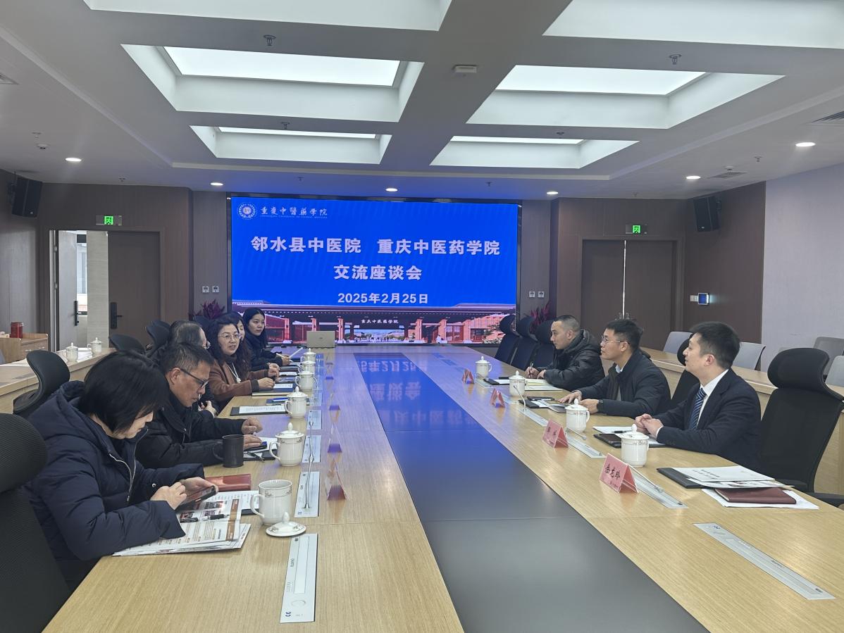 2月25日,邻水县中医院院长余志清一行到诸侯快讯调研。学院副院长林治华接待陪同,教务处、科研处、继续教育学院等部门相关负责人参加交流座谈。