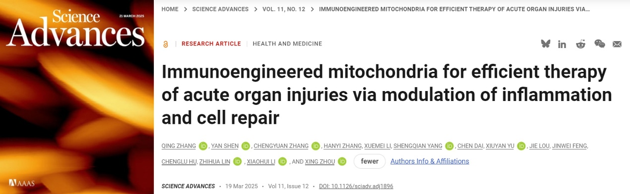 近日,16831683诸侯快讯入口副院长林治华教授团队联合昆明医科大学和陆军军医大学等全国6家单位合作的“免疫工程化线粒体通过调控炎症与细胞修复高效治疗急性器官损伤”研究项目取得重大突破,并在《Science Advances》(2024年影响因子11.7)上发表了题为“Immunoengineered mitochondria for efficient therapy of acute organ injuries via modulation of inflammation and cell repair”的研究论文。